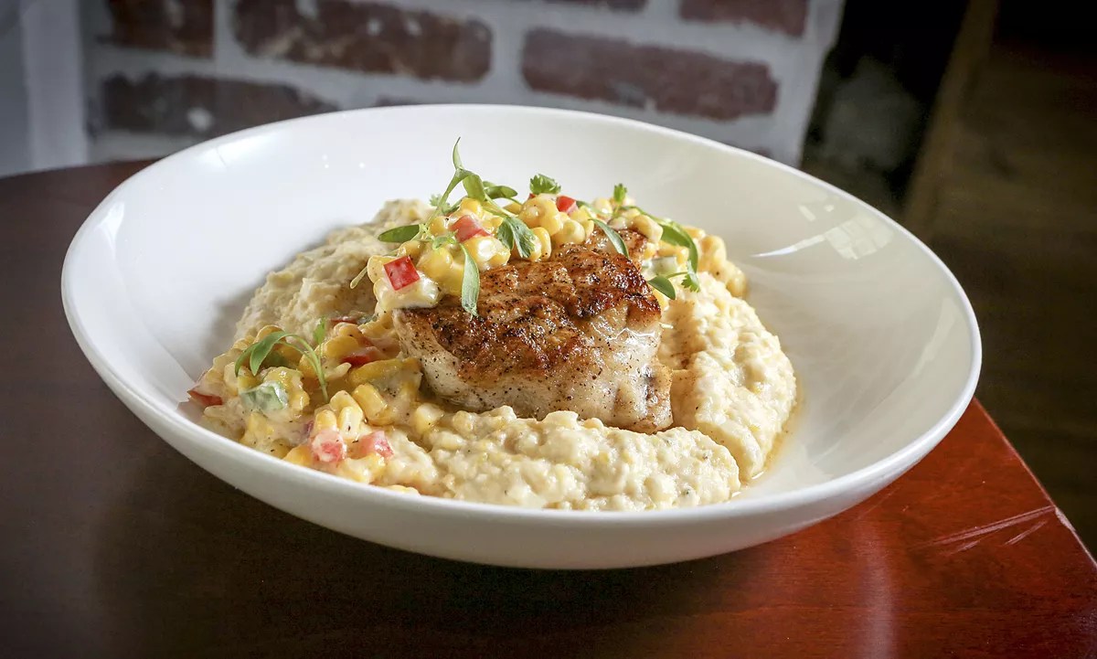 For staples, the kitchen reaches a bit further. A sticky mound of grits began life at Arkansas’ War Eagle Mill and are sweetened with corn kernels. The whole thing is plated with a hefty monkfish loin boasting a gorgeous sear that results in a texture part delicate snapper and part meaty swordfish.
