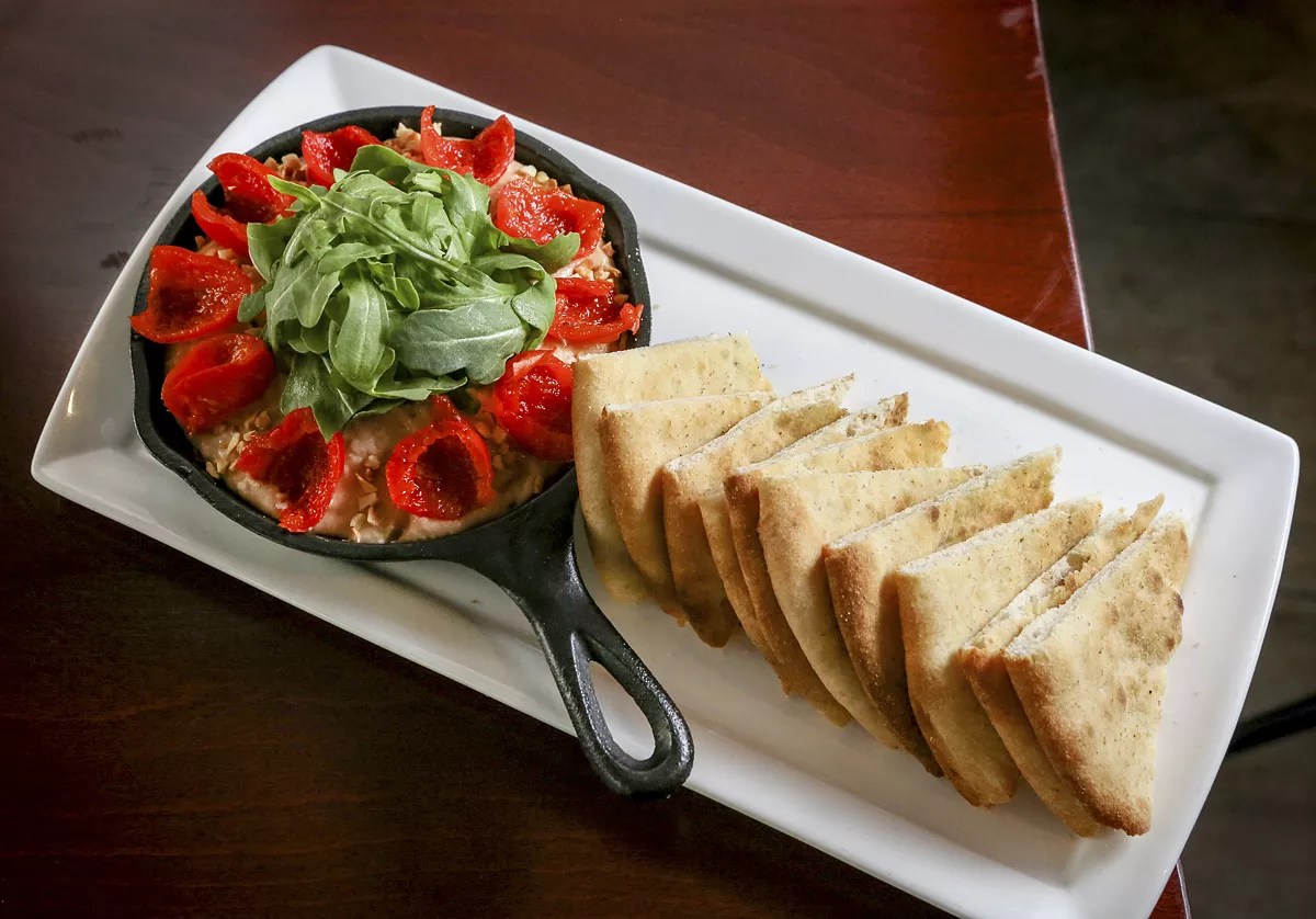 All of those veggies play well around milky slices of hand-pulled mozzarella. Pickled Peppadew peppers and red onions offer heat, while a vinegar brine on plump garlic cloves brings out their sweetness. Other starters – the largest section on the two-page menu – are predictable except for Buffalo turkey wings doused in a Maytag blue cheese sauce. A white bean hummus sounds promising, but other than the Peppadews poking out of the smooth purée, it’s bland and screaming for more tahini and acid.