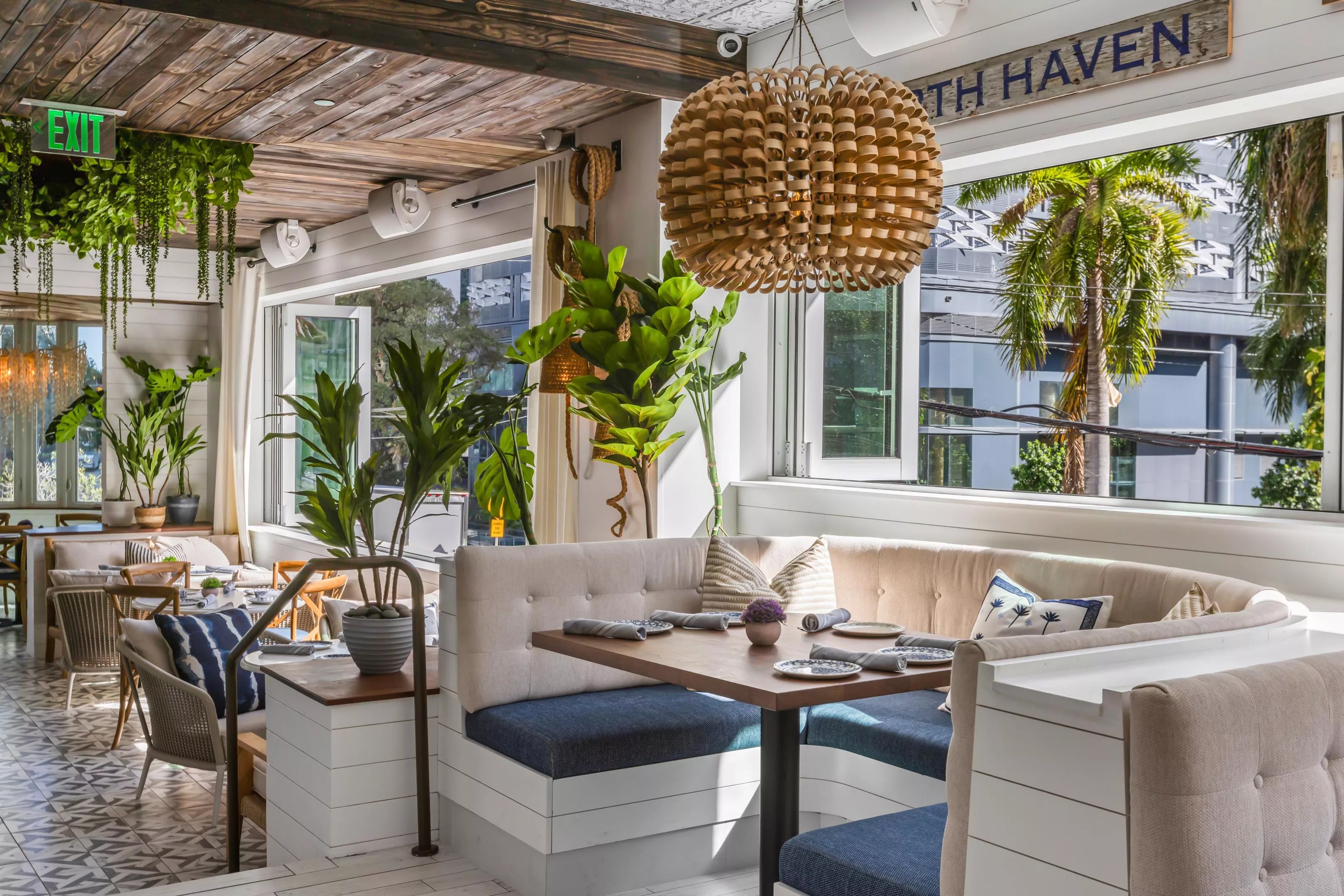 Coastal-inspired elements include lots of rope and wicker, which complement the exposed wooden beams, white-washed wooden tables, and statement chandeliers made of seashells. Spanning more than 8,000 square feet, the restaurant’s dining room features large windows that flood the space with natural light and will open during Miami’s cooler months.