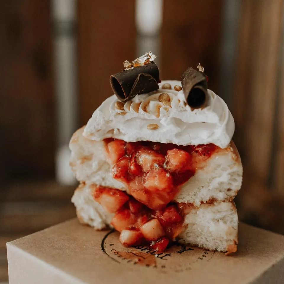 The second doughnut calls for the company’s prosecco, which is reconstructed into a jelly and stuffed inside the doughnut’s center with diced strawberries ($6 to $8). It’s garnished with a gold merengue disk, dark chocolate curls, strawberries, and gold foil.