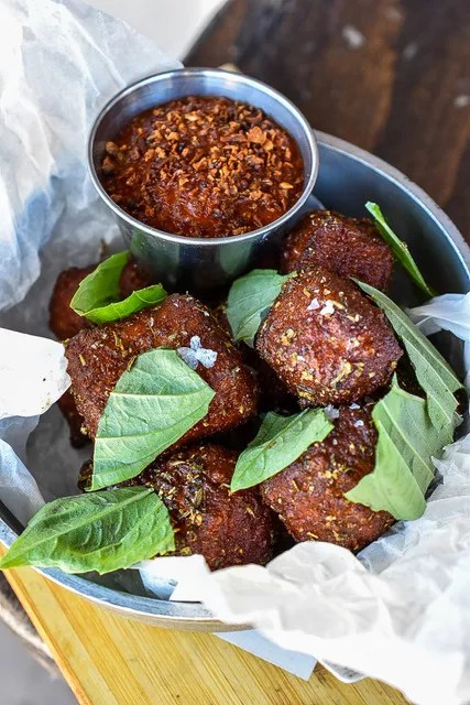 Various locations Chef Rapicavoli’s ode to Frankie’s Pizza: queso frito bites with tomato-basil sauce. Photo courtesy of Eating House