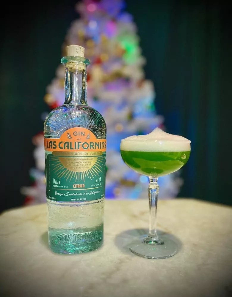 “El Grinch” is made with Las Californias gin, passion fruit liqueur, Blue Curacao, lime, agave, and hibiscus salt foam.