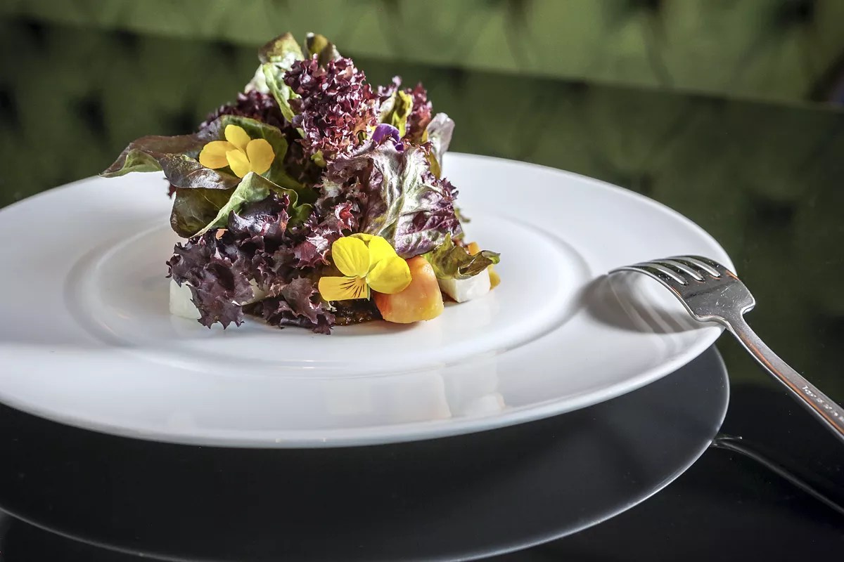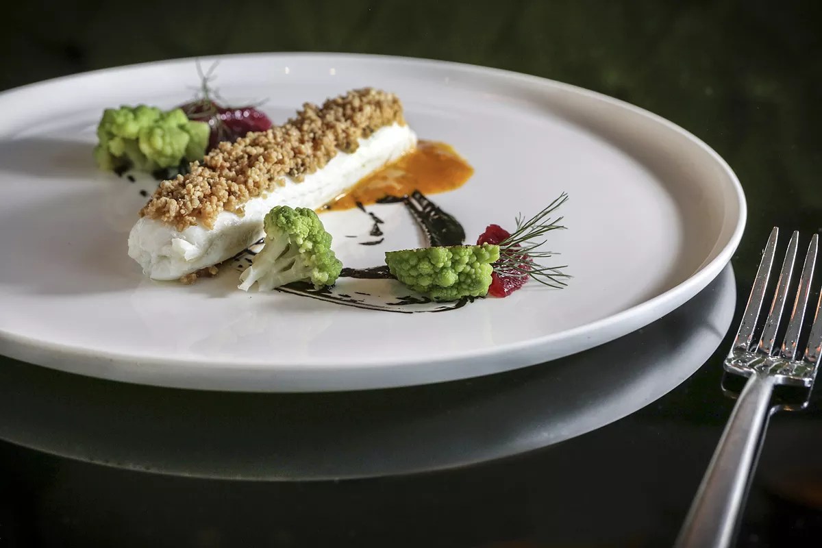 On a recent Saturday night, the dining room was about half full. It’s outfitted with midcentury modern furnishings such as royal-blue velvet chairs and sleek gold-trimmed black tables. An impressive Frida Kahlo portrait hangs adjacent to a marble bar facing an open kitchen. Diners interacted with chefs there during a meal. Spanish dover sole ballotine Photography by CandaceWest.com