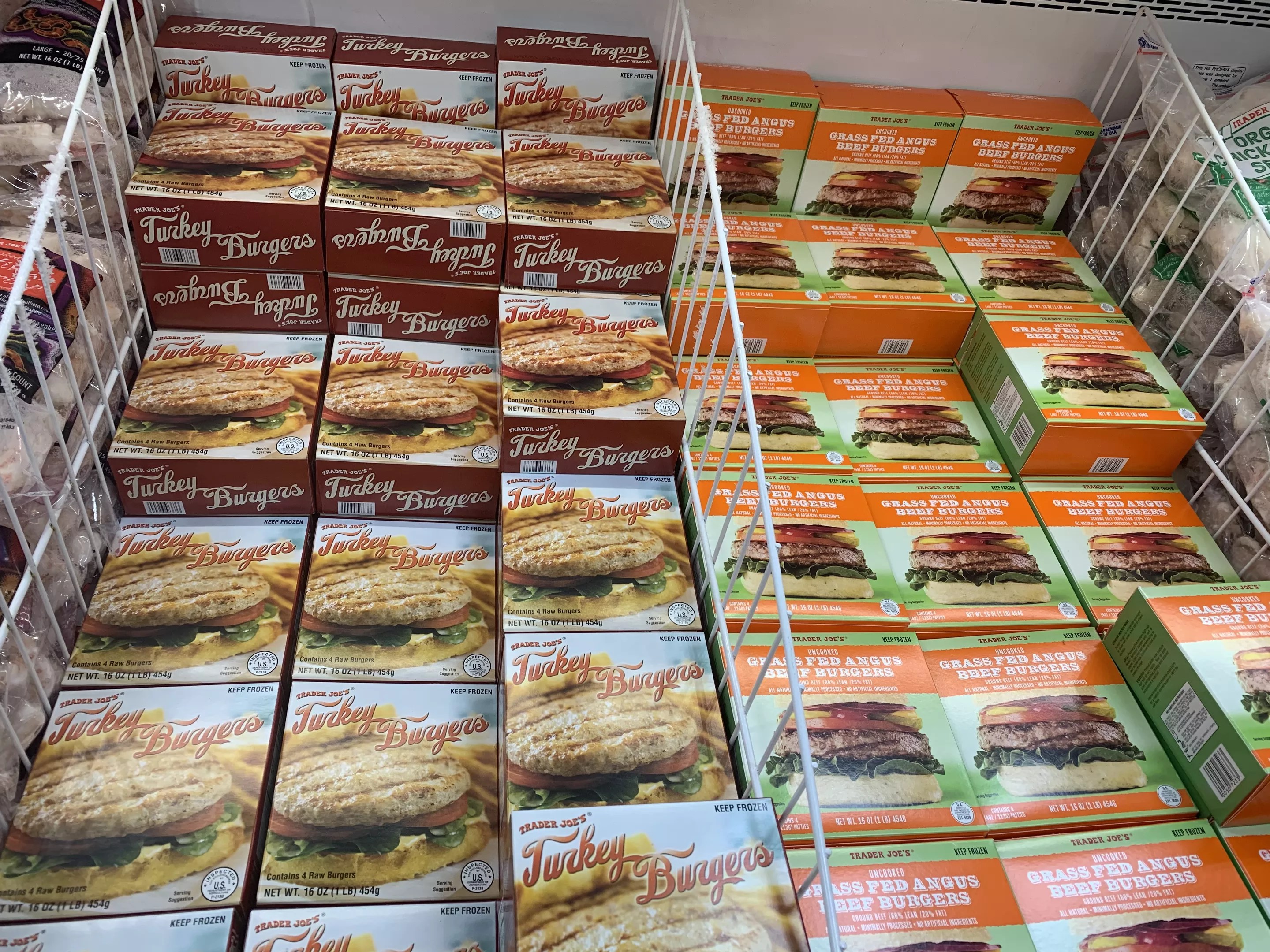 What’s the most requested snack during the big game? If it’s not wings, it’s gotta be pizza. TJ’s has you more than covered in this department. Find an extensive selection of pizzas to slice up for a spread. The bambino pizza formaggio ($3.29) is a great appetizer to add to the table. Or get barbecue chicken pizza, mushroom and black truffle flatbread, and the pizza parlanno to create an all-out feast. The hot and spicy chicken wings ($6) come in a large bag and pop in the oven. Don’t forget to grab some blue cheese or vegan ranch dressing for the wings. Burger options at Trader Joe’s. Photo by Nicole Zimmerman