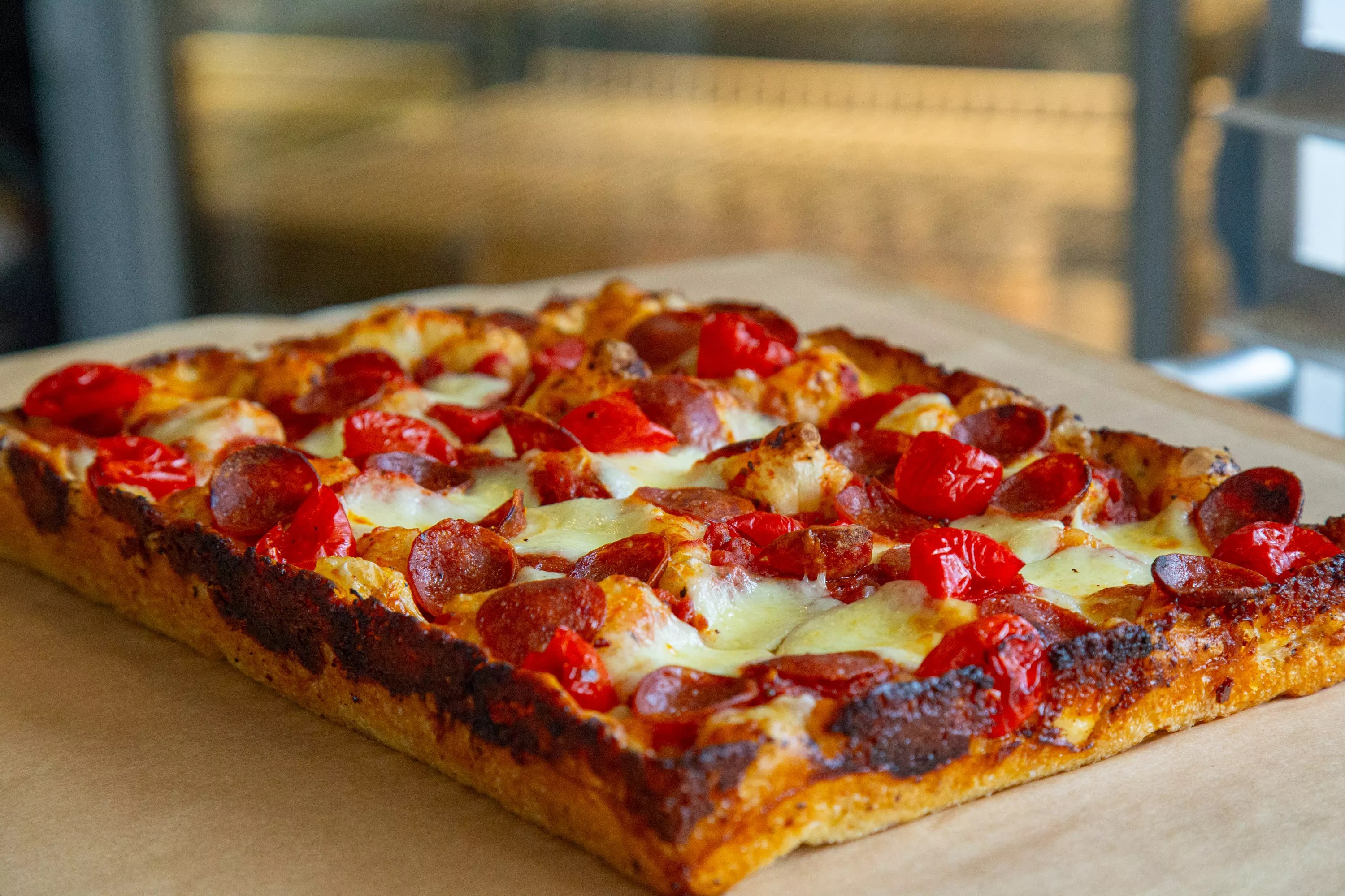 True Loaf’s Detroit-style pizza offerings include classic cheese and tomato sauce, as well as a slightly spicy rendition featuring Ezzo pepperoni cups and Peppadew peppers.