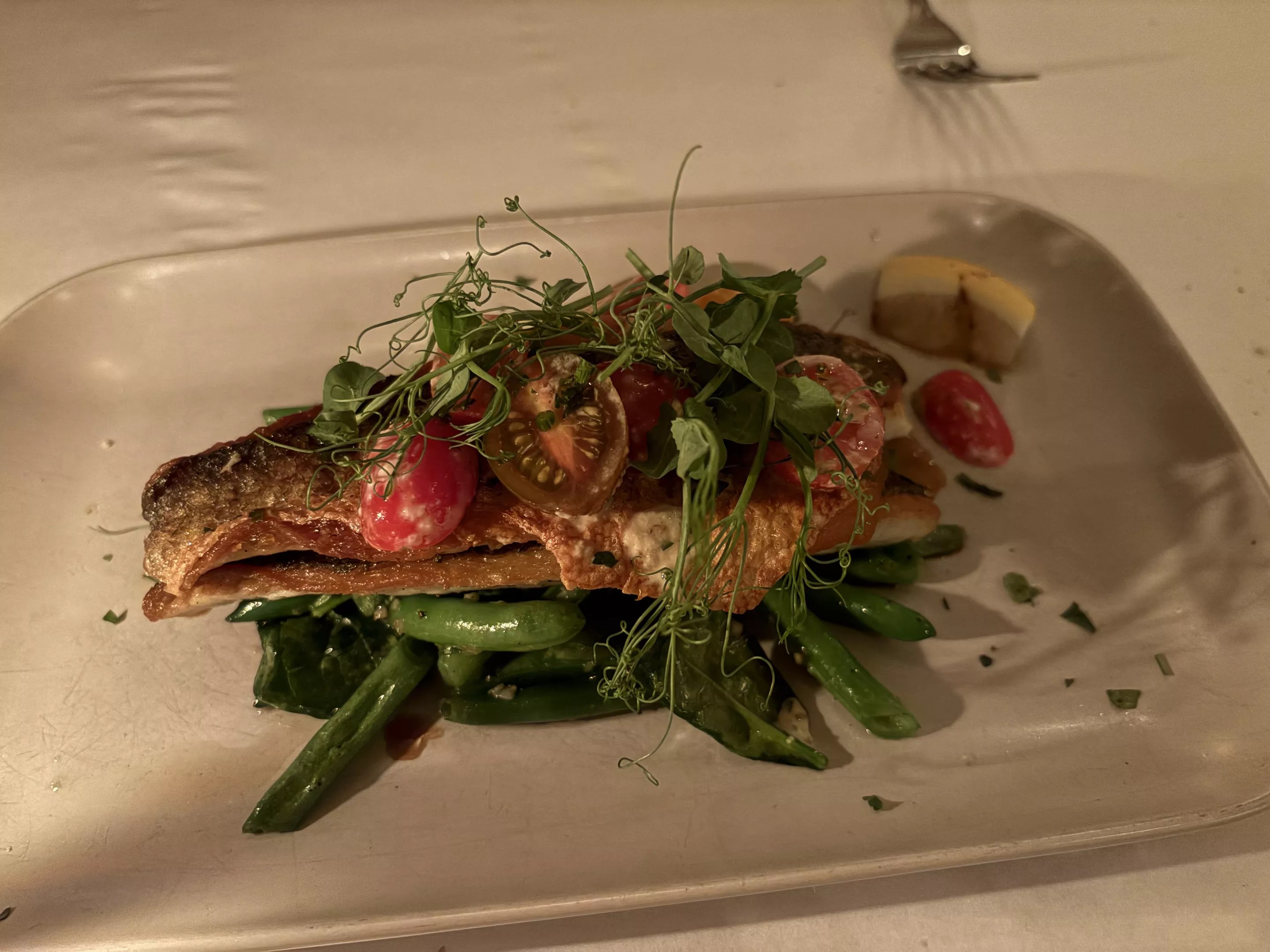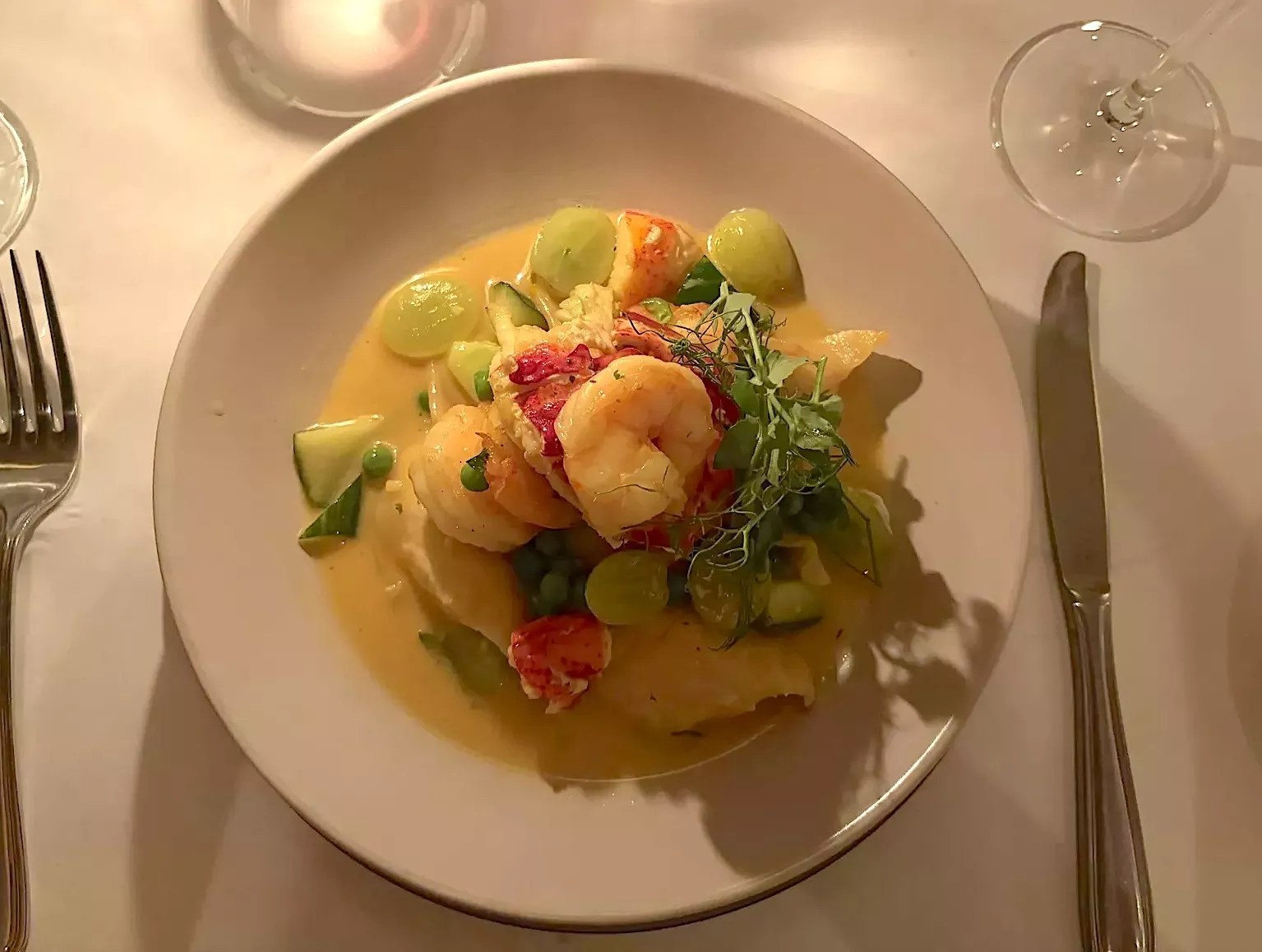 The entrees were lobster, shrimp, polenta ravioli with grapes, cucumber, and saffron ($48), and pan-cooked branzino with heirloom tomato salad ($42). Though upscale, the portions are hearty, and you’re likely to leave with leftovers. However, there is one peculiarity on the menu. Sharing the column with steak with truffle fries ($48) and a double-cut pork chop ($42) is none other than the heart of post-1945 suburbia cooking: meatloaf.