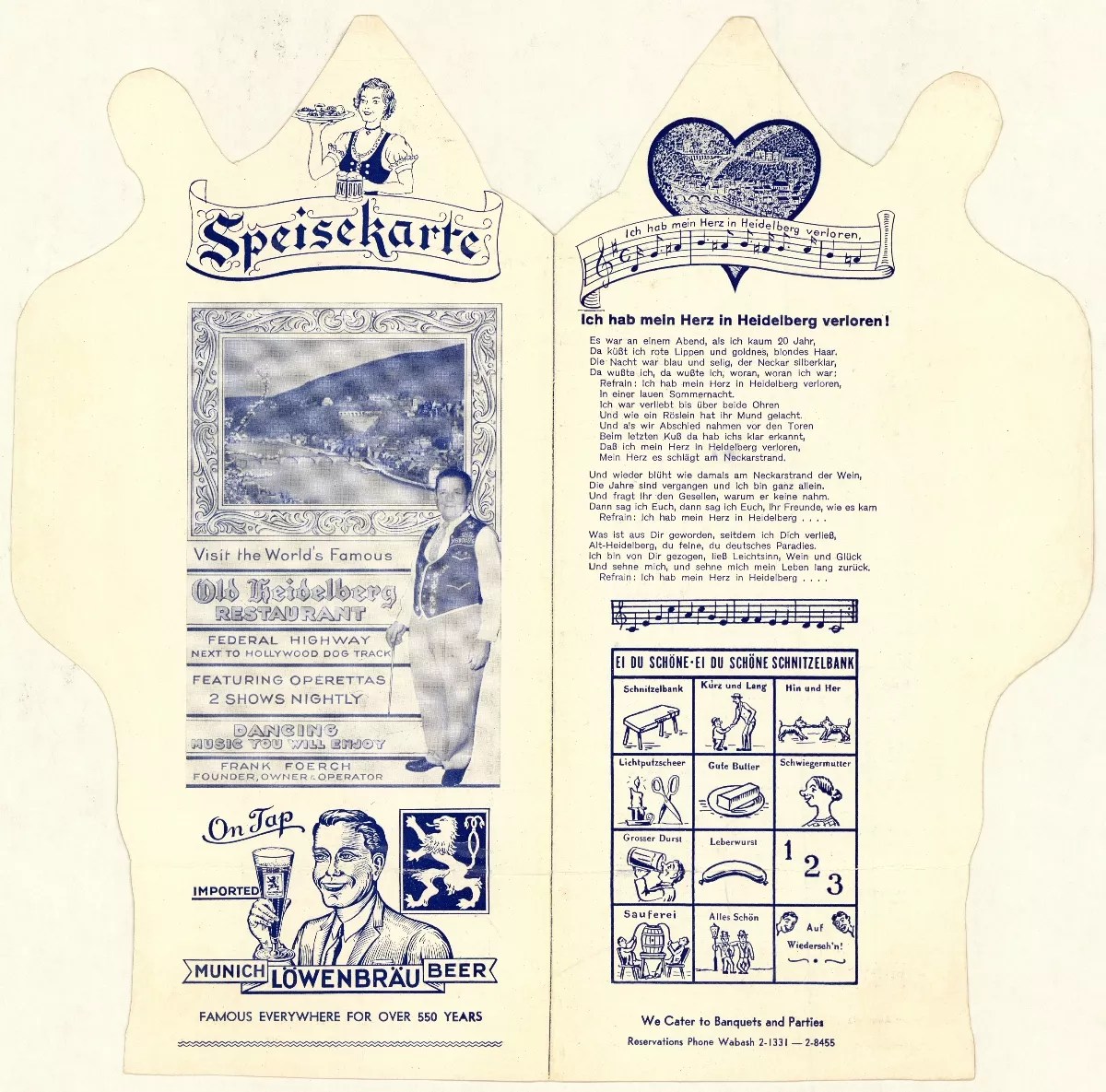 But it’s an illustrated menu shaped like a stein that offers a look at one of the area’s longest-standing restaurants, Old Heidelberg in Fort Lauderdale. The nearly 80-year-old menu tells the story of founding owner Frank Foerch, who opened the original establishment sometime in the 1930s, a half mile from Gulfstream Park in Hallandale. His dream: to bring something “new, different, and original” to Florida, it states.