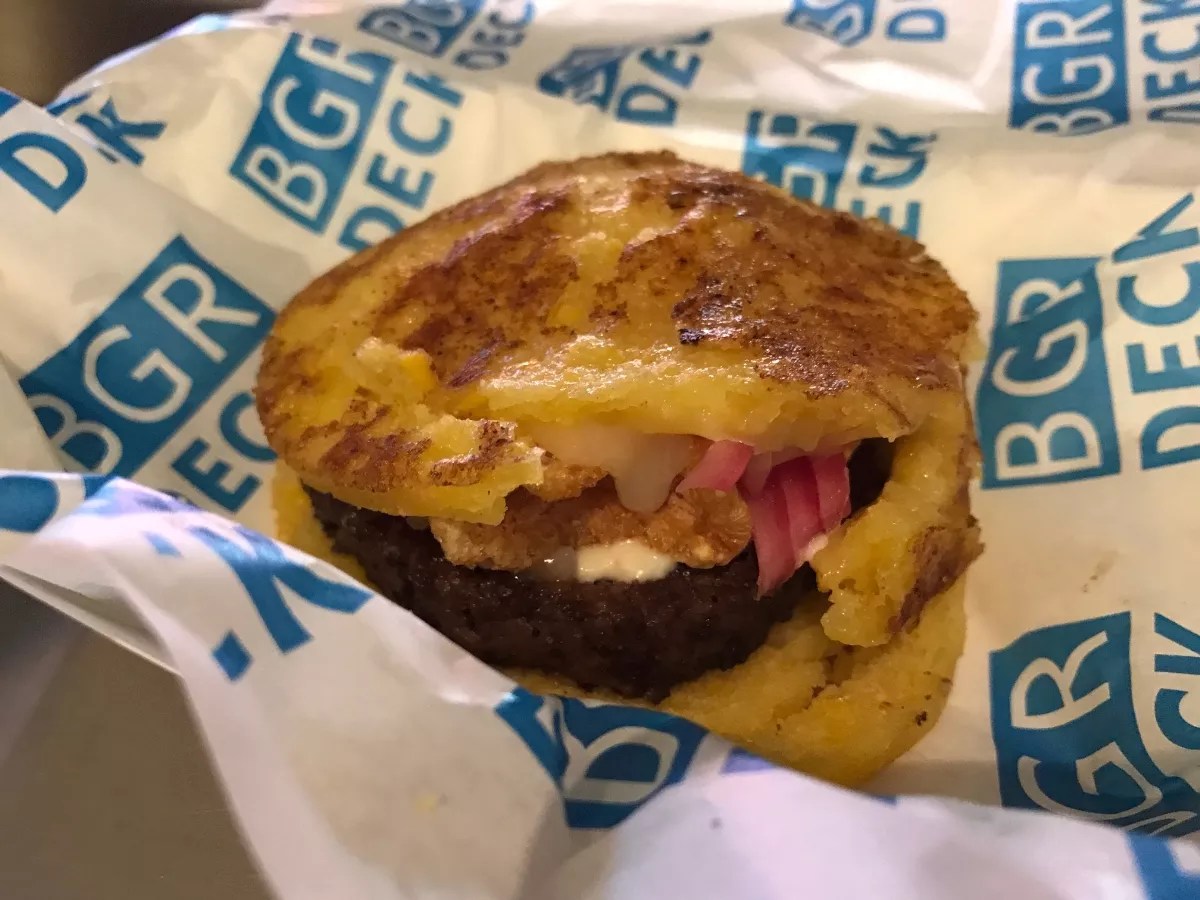 In a surge of nostalgia, Chef Navarrete channeled the days when the Marlins played at Joe Robbie Stadium (before the many name changes). The tradition included getting a classic sweet corn arepa from carts outside the stadium. Navarette uses those sweet arepas as the bun for his brisket/short-rib patty and then adds mozzarella, pickled onions, and cilantro lime aioli. That crunch when you bite into your arepa burger? Chicharrones!