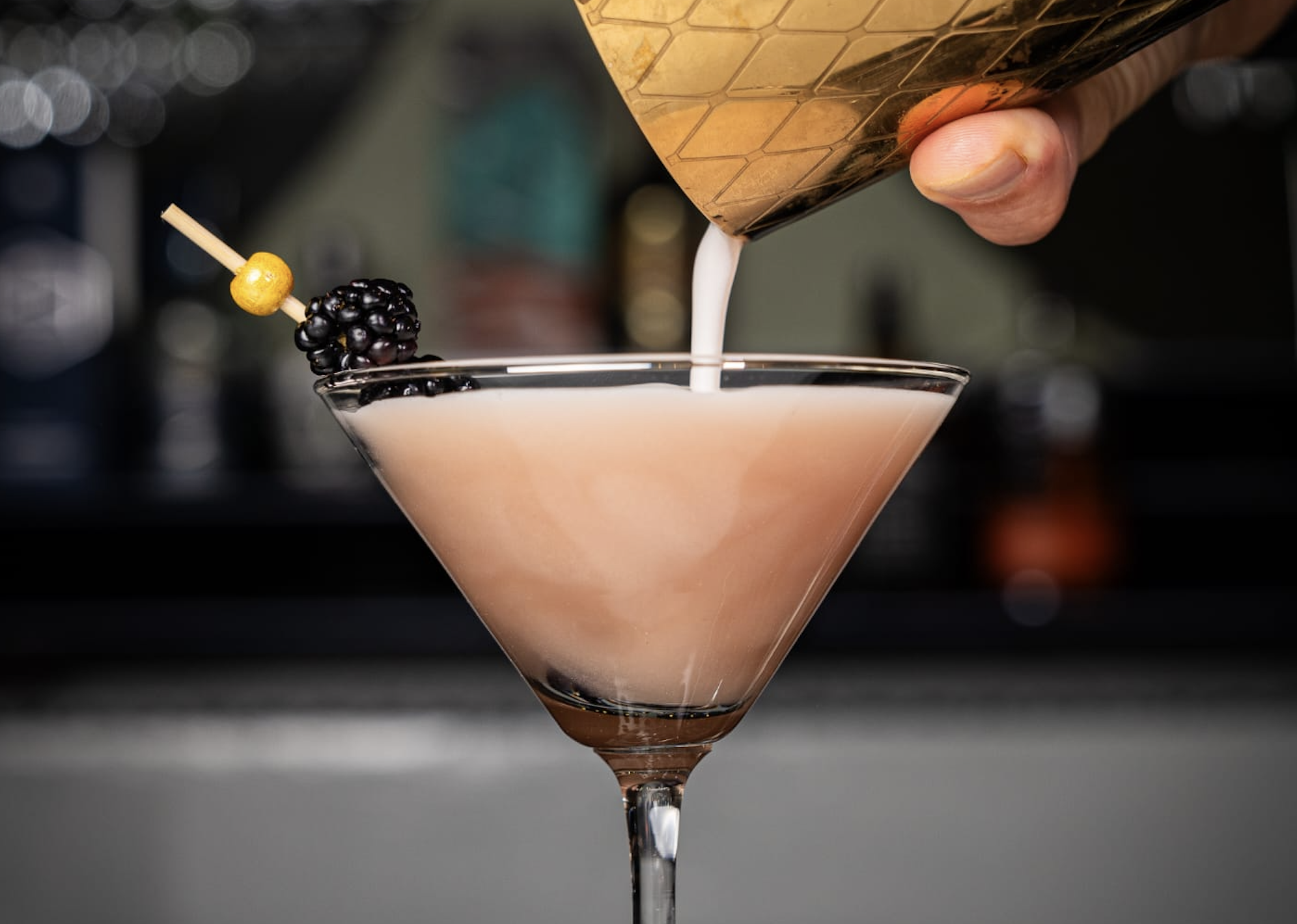Tango with the Tiger: Añejo tequila, Licor 43, egg whites (substitute fee foam), blackberry syrup, Pomelo, and pear juice