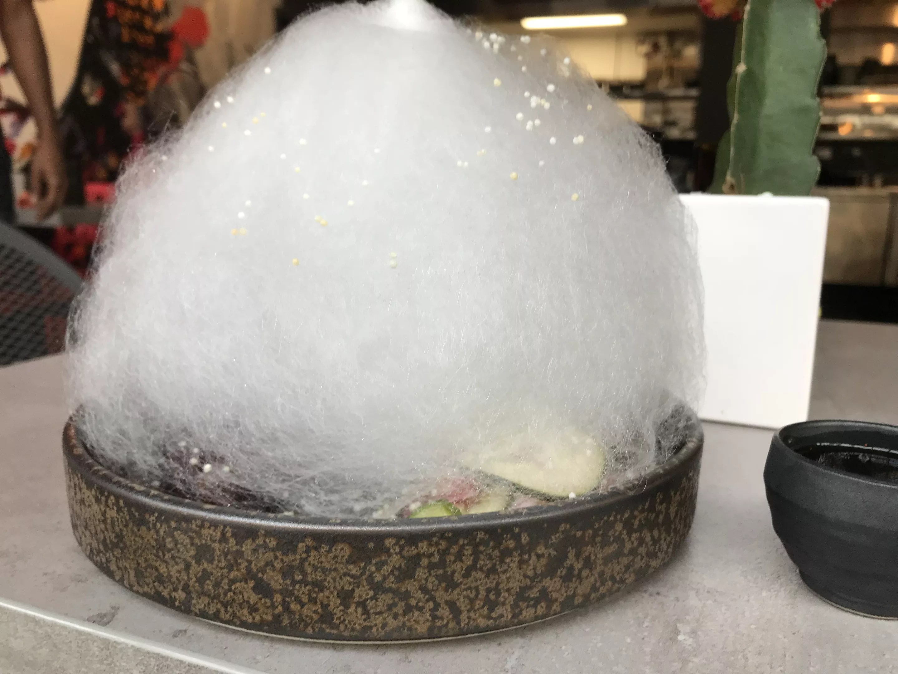 The most unusual item might be the pork belly cloud ($12). Pork belly is cooked sous vide for 48 hours and presented with a cotton-candy topper. When it arrives at the table, a server pours ponzu sauce on top to melt the sweet strands into a glaze.