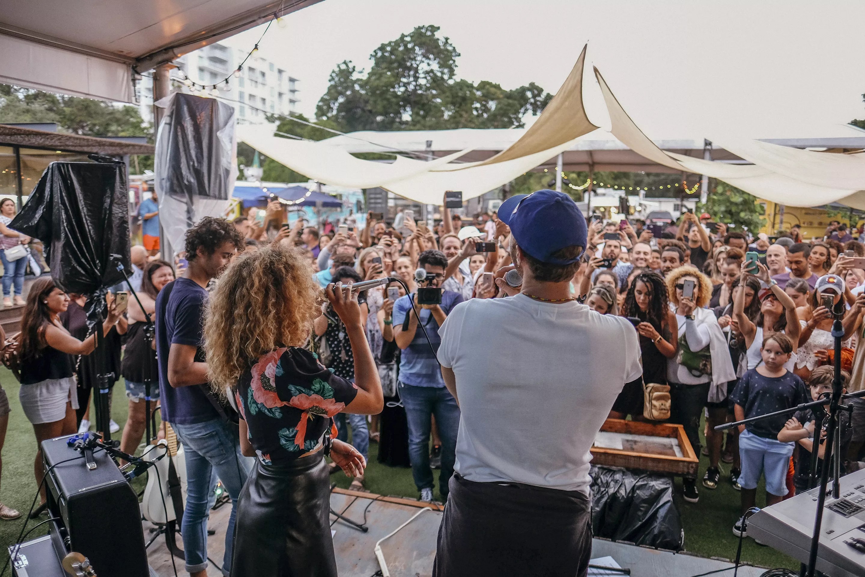 Tonight Coldplay will fill Hard Rock Stadium with thousands of attendees eager to hear Chris Martin’s voice belt out hits like “Yellow” and “Adventure of a Lifetime.” But some fans experienced that excitement early, in a far more intimate venue, when Martin joined Coldplay opening act Izzy Bizu onstage at the Wynwood Yard last night. Bizy and Martin Photo by FujiFilmGirl / Andrea Lorena