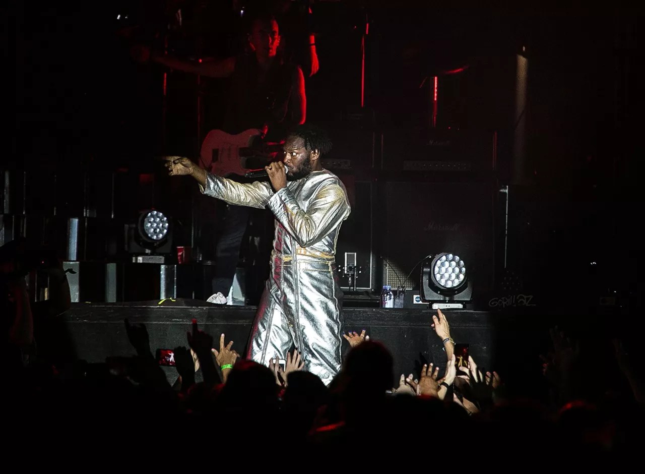 Instead, last night, Albarn stood front and center with a six-piece band, six – yes, count ’em, six – singers to round out the backing vocals, and collaborators like Peven Everett and Jamie Principle coming on stage as needed. That’s not to say the fictional quartet didn’t make any appearances. There were interstitials throughout the set introducing the band members, and accompanying music videos were used to bolster visuals.