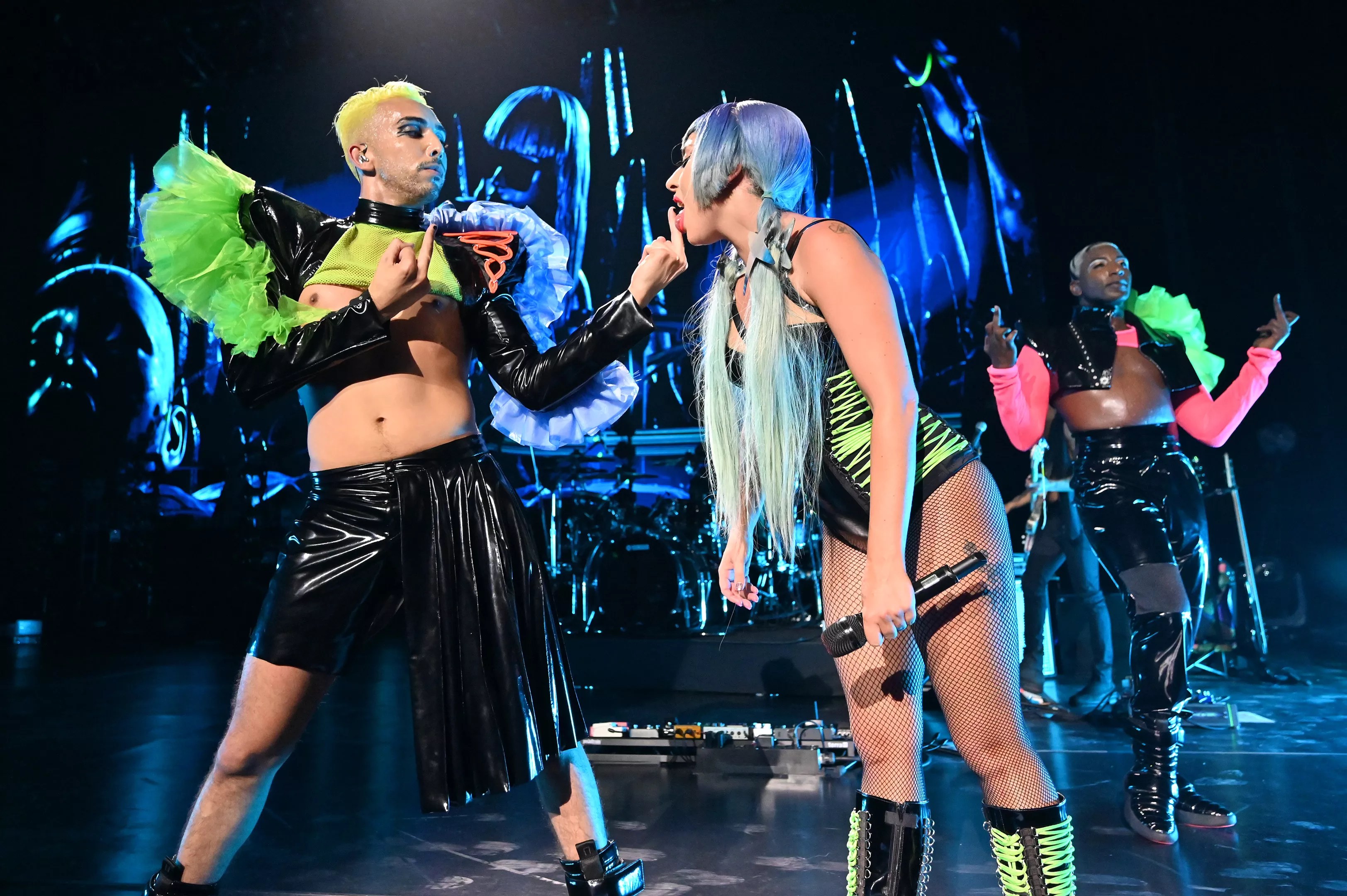Gaga began her set shortly before 11:30. As she did for her Super Bowl halftime performance in 2017, the pop star entered the venue from above, flying over fans’ heads on wires that lowered her and pulled her back up as she made her way to the stage to the tune of her breakthrough single “Just Dance.”