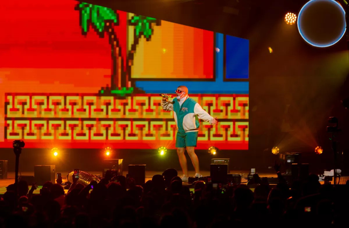 By the time headliner Bad Bunny hit the stage around 11:30 p.m., the crowd’s drinks had kicked in and they got a second wind. As Spotify-branded bracelets lit up the arena, the Puerto Rican leader of the Latino Gang emerged wearing a vintage Florida Marlins jacket with matching teal shorts, a surgical mask, and light-up shades. His left-field fashion choices were a reminder of how quickly he’s gone from Latino urbano’s oddball to its leading trendsetter. Throughout his nearly one-hour set, Bunny mostly ran through songs from his surprising and adventurous debut album, X 100pre and Oasis, his collaborative album with J Balvin. Among the songs he played were “Callaíta,” the “Te Bote” remix (it’s puzzling why he and Jam didn’t just play it together), and “Estamos Bien,” the latter being among the songs the crowd screamed the loudest.