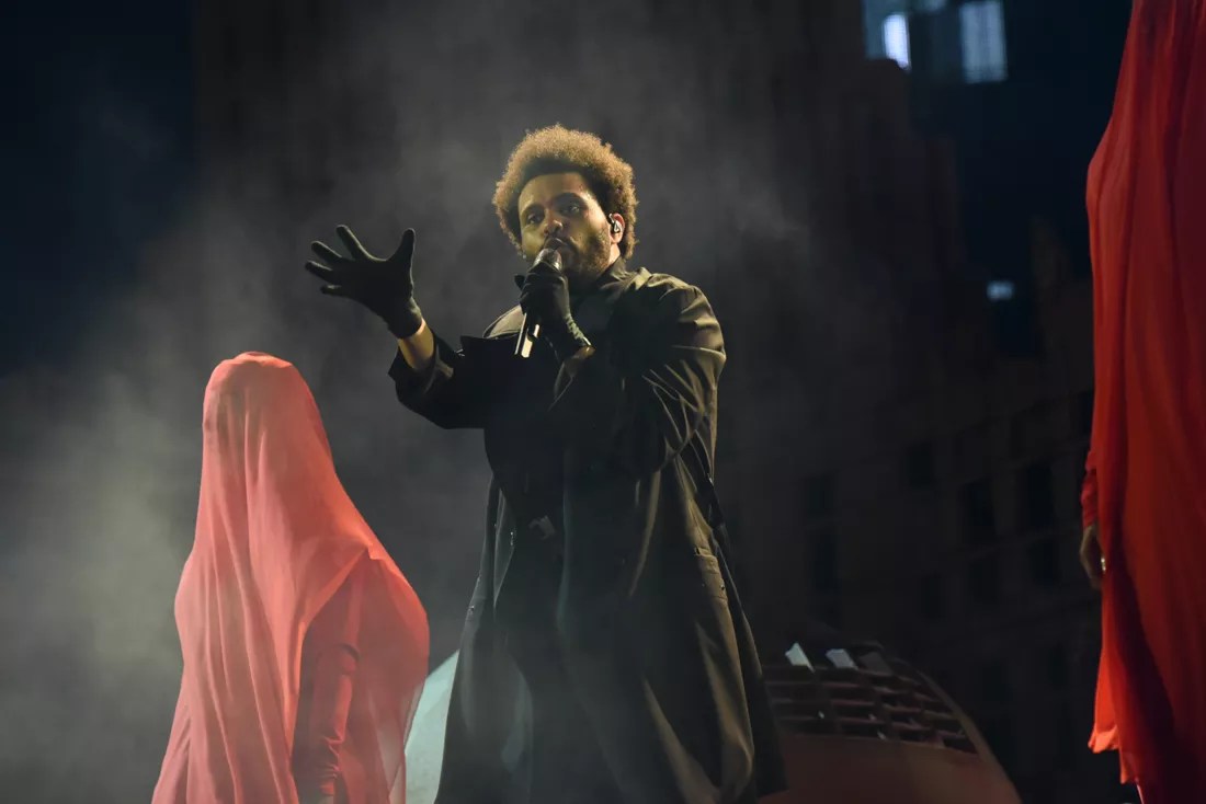 Constructed of large post-apocalyptic-looking buildings, the stage setup featured dilapidated tops of skyscrapers, smoke, and lights from which Tesfaye rose to start the show with “Alone Again” from the album After Hours. A posse of veiled dancers dressed head-to-toe in bright red, flowing fabric and moved in rhythmic circles, reminiscent of a religious ritual. The Weeknd, on the other hand, was in an all-black ensemble, including a trench coat with a red silk lining and black gloves. Noticeably lacking was his famously bruised nose bound with medical tape. (Luckily, many fans came to show sporting the signature look.)