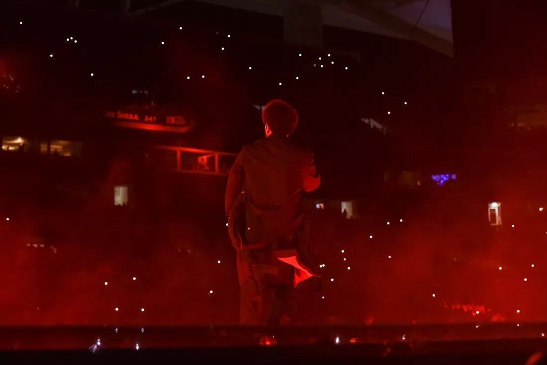 In one instance, Tesfaye pulled the microphone down and basked in the sound of the stadium singing his lyrics back to him. With all spotlights on the runway pointed toward the sky, it almost looked as if they originated in heaven itself and were actually all pointing back to the “chosen one,” the Weeknd.