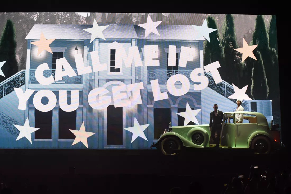 Finally, around 10 p.m., they were rewarded with Tyler slowly rising out of the stage in the backseat of an aqua-hued replica of a 1939 Rolls Royce. He spat lyrics from his newish track “Sir Baudelaire,” asking everyone, “Y’all ready?” They certainly were, as literal fireworks went off from the rafters and the façade of a two-story country house was revealed as the backdrop.