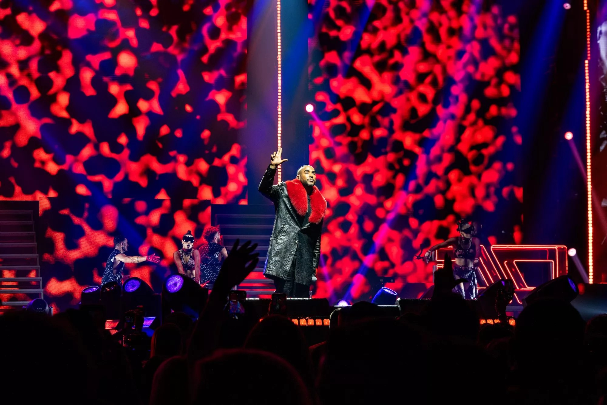 The crowd was treated to another video presentation before the dancers came out clad in futuristic silver costumes as Don launched into “Virtual Diva,” one of the evening’s top sing-along moments. Blue and purple lights covered the crowd and stage as he transitioned into “Blue Zone,” followed by “Guaya Guaya” and “Hasta Abajo.”