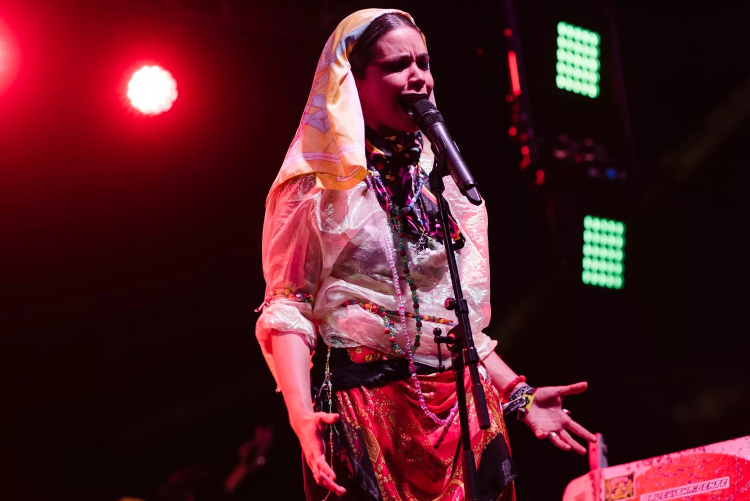 Beach House. The indie-rock darlings of Beach House and their gauzy, melancholic sound kicked off day one’s headlining performances on the main outdoor stage, Mind Melt, around 9:20 p.m. with a performance that was at once languid and larger-than-life. Singer Victoria Legrand’s signature heavy fringe cast a moody shadow over her eyes while the rest of her sequined body shimmered in strobe lights. The entire set playing out against a Milky Way-like backdrop of inky blue shades and kaleidoscopic lights. “Dive,” from 2018’s 7, was the perfect entry point into the Baltimore duo’s dreamy, layered performance, starting out slow, balmy, and contemplative and building up to an exhilarating, cinematic breakdown that spoke to a crowd of wavy bodies and closed-eyed head-nodding. Other standout tracks came from across the band’s substantial Pussy Riot. View more photos from III Points 2019 day one here. Photo by Karli Evans