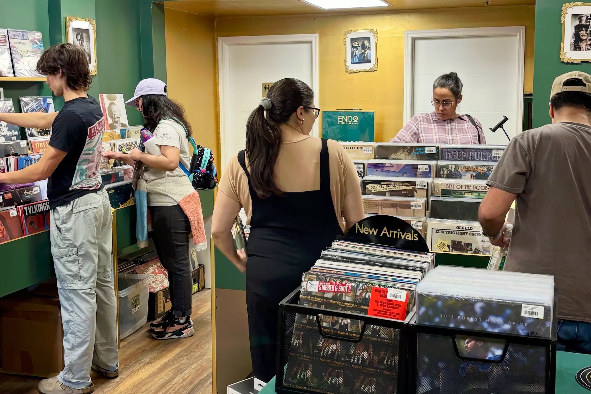 Endo’s Instagram posts highlight the store’s stock of about 5,000 new and used records. Sparks restocks the inventory multiple times a week and hunts down records from local distributors. The store also offers a buying and trading program for used records, which are cleaned, tested, and refit with an inner sleeve before they make it to the bins.
