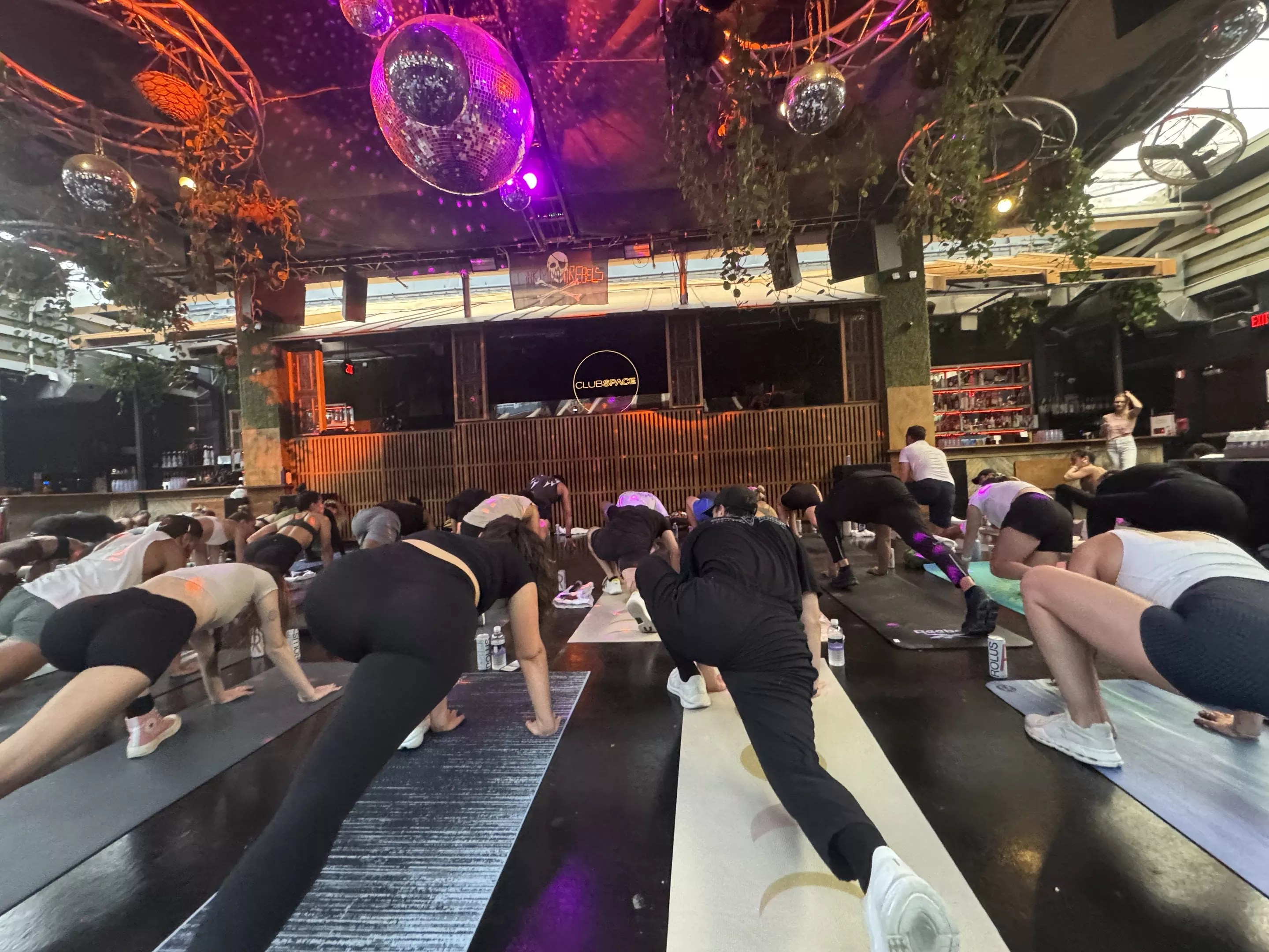 The light sprint was a warm-up for the 50-minute workout class, which was as intense and energetic as the tech house playlist booming over the speakers. Chavez led the session while Summit followed on his exercise mat in the middle of the dance floor. The calorie-scorching class included burpees, push-ups, planks, and squats. As the crowd panted through his hit song, “Shiver,” the DJ boosted the crowd’s morale: “Club Space, how the fuck we feeling baby?”