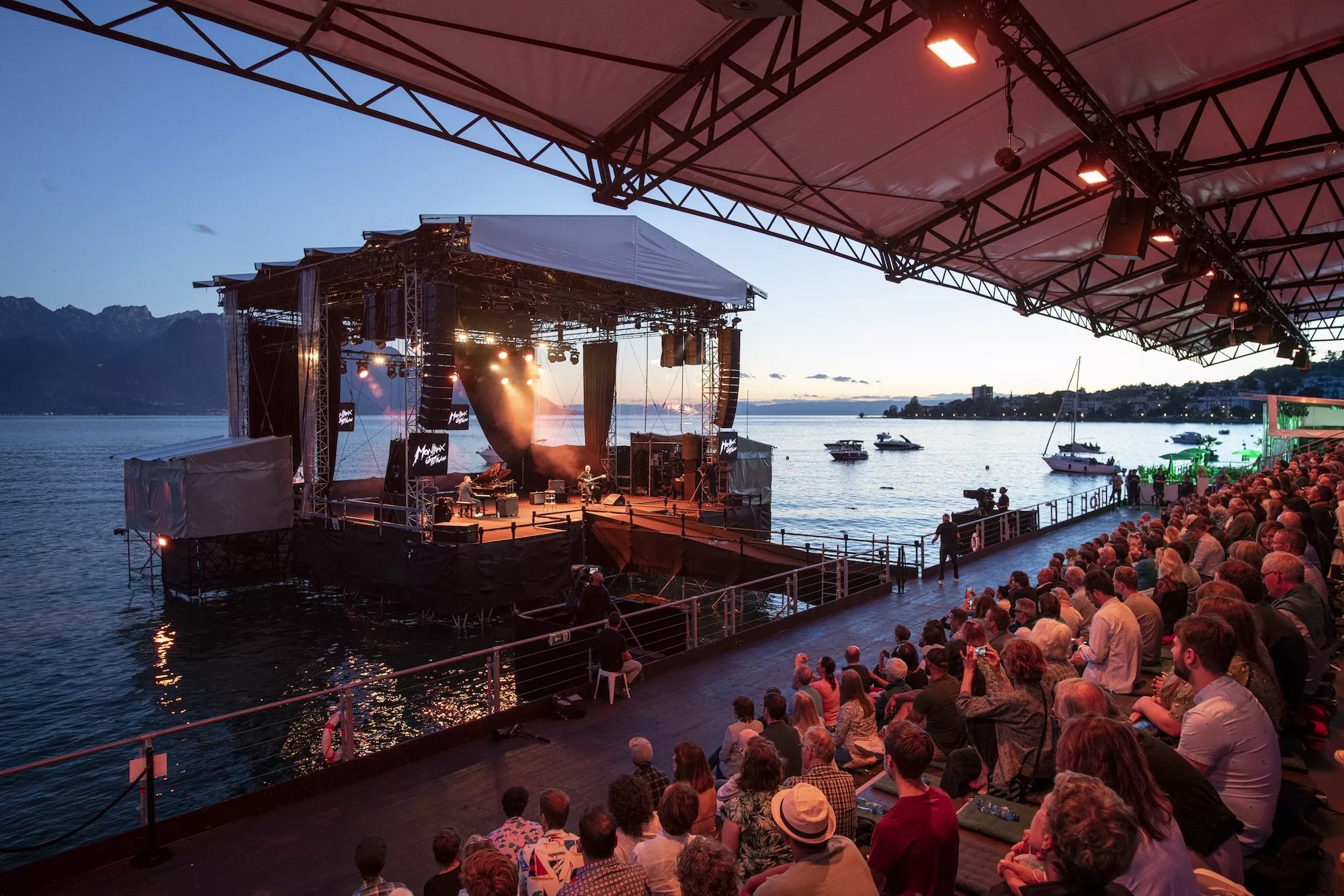 The original Montreux Jazz Festival takes place in Switzerland along the shoreline of Lake Geneva.