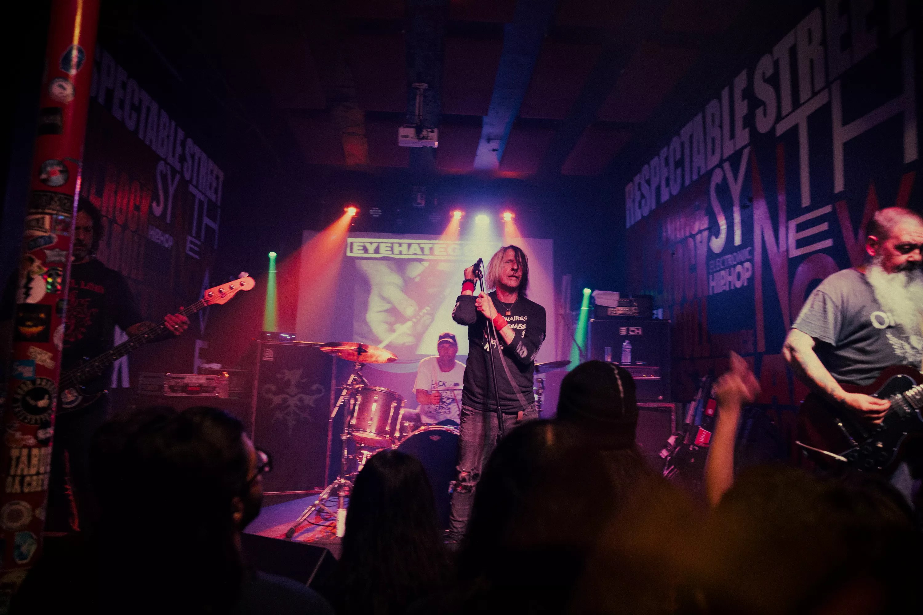“We’re having fun,” Eyehategod vocalist Mike Williams said midway through the NOLA legend’s set. “We like having fun. We have a history of having fun.” Indeed, for a band whose best-known jams include songs with titles like “Sisterfucker (Part 1),” “Medicine Noose,” “Lack of Almost Everything,” and “Kill Your Boss,” Eyehategod does seem to be in a very happy, healthy place. (The impromptu jam of a few bars of Black Flag’s “Gimme Gimme Gimme” was a fun touch.) And the band is sounding freaking phenomenal these days. Guitarist Jimmy Bower is a national heavy metal treasure churning out grooving homages to/perversions of the Black Sabbath gospel, book of Vol. 4 with the verve and precision of a seasoned artisan – something that felt a little poignant coming so close to the final Sabbath/Ozzy show a few weeks ago. This is less surprising than Williams maintaining his voice and attack, which is somewhat unusual in his extreme metal field, generally speaking, never mind for a guy who has lived as hard and been through as much as he has. (Remember, this is a man who stared death down, waiting for a liver transplant less than a decade ago.) The dialed-in set had a victory lap vibe, yet the serrated edge was never lost. Eyehategod played a sold-out show at Respectable Street. Photo by Maysa Askar / Courtesy of Heroes Live Entertainment