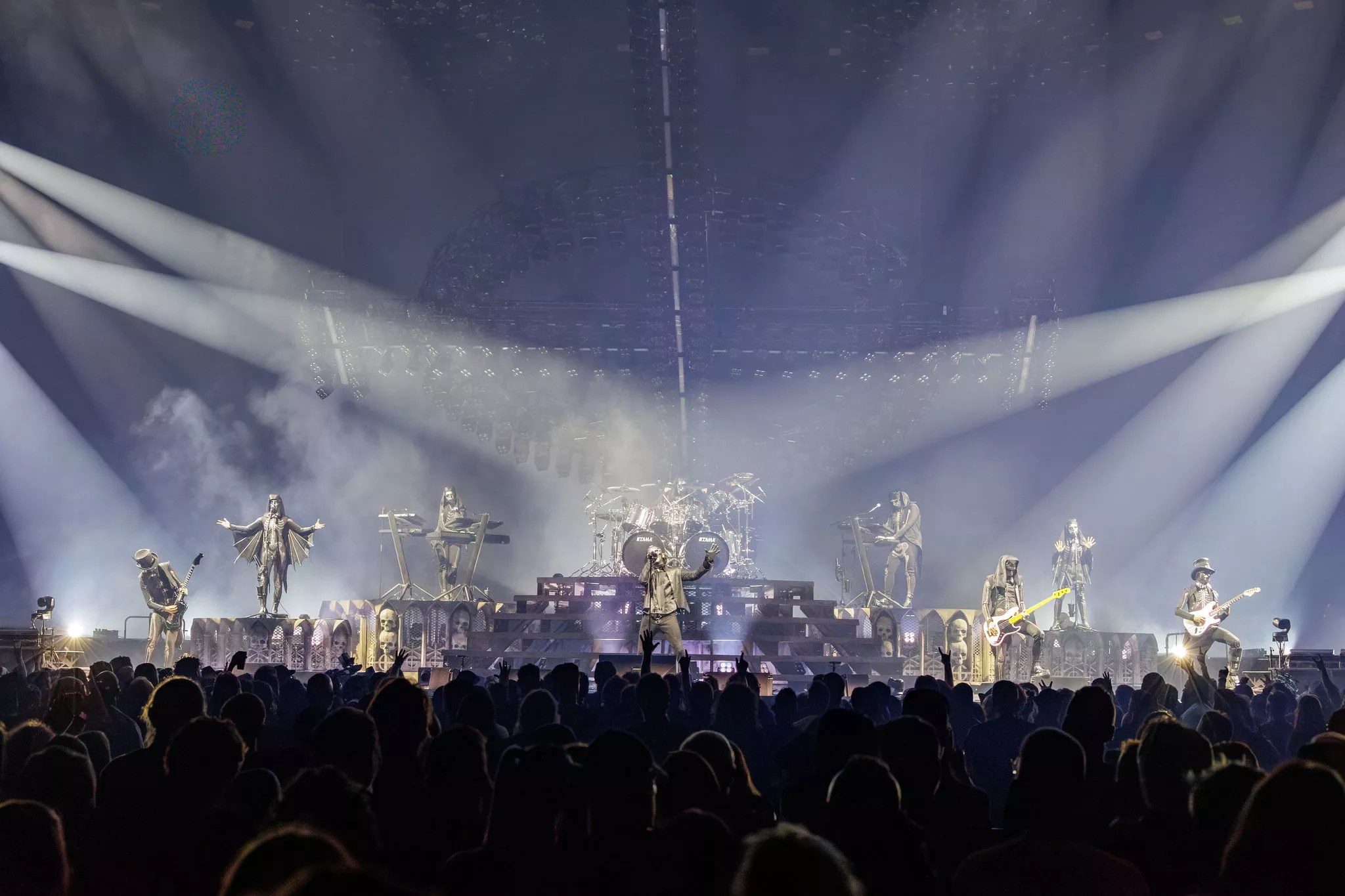 Frontman Tobias Forge sings about the devil, backed by a seven-piece band dressed like skeletons.