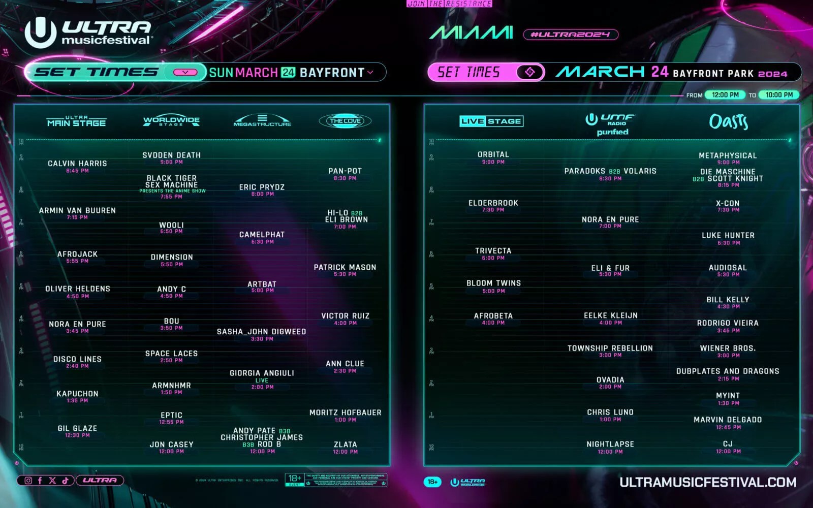 Ultra released all the set times earlier this week, breaking things down across the seven stages: Ultra Main Stage, Worldwide Stage, Megastructure, the Cove, Live Stage, UMF Radio, and Oasis. A few notable takeaways are that Carl Cox will not make an appearance this year and that there’s no A State of Trance takeover despite van Buuren being on the lineup.