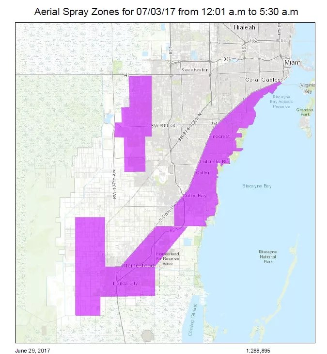Despite this, the county and state say naled is still the most effective pesticide they can use to quickly knock down mosquito infestations. In fact, the county’s Department of Solid Waste Management says its planes will spray more naled over huge portions of southern Miami-Dade County early this Monday morning. The planes could fly anywhere from 12:01 a.m. Monday, through 5 in the morning.