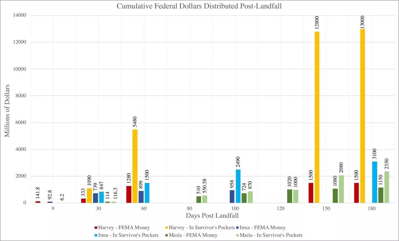 The trend continued during the recovery. Two months after each storm, Texans and Floridians received almost $1 billion in FEMA aid. It took four months for Maria victims to hit that same number.