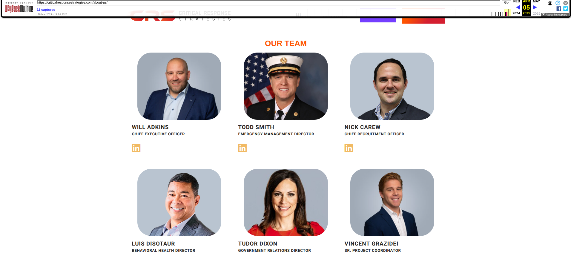 The screenshot at the top of this story shows the “404” error message that currently appears on the “About Us” page of the website for Critical Response Strategies, a Jacksonville-based firm that was awarded a $78 million contract for security and support services at the site. But New Times found that when the Internet Archive’s Wayback Machine crawled that page as recently as May 13, its “Our Team” section included the names and headshots of the chief executive officer, emergency management director, and other higher-ups.
