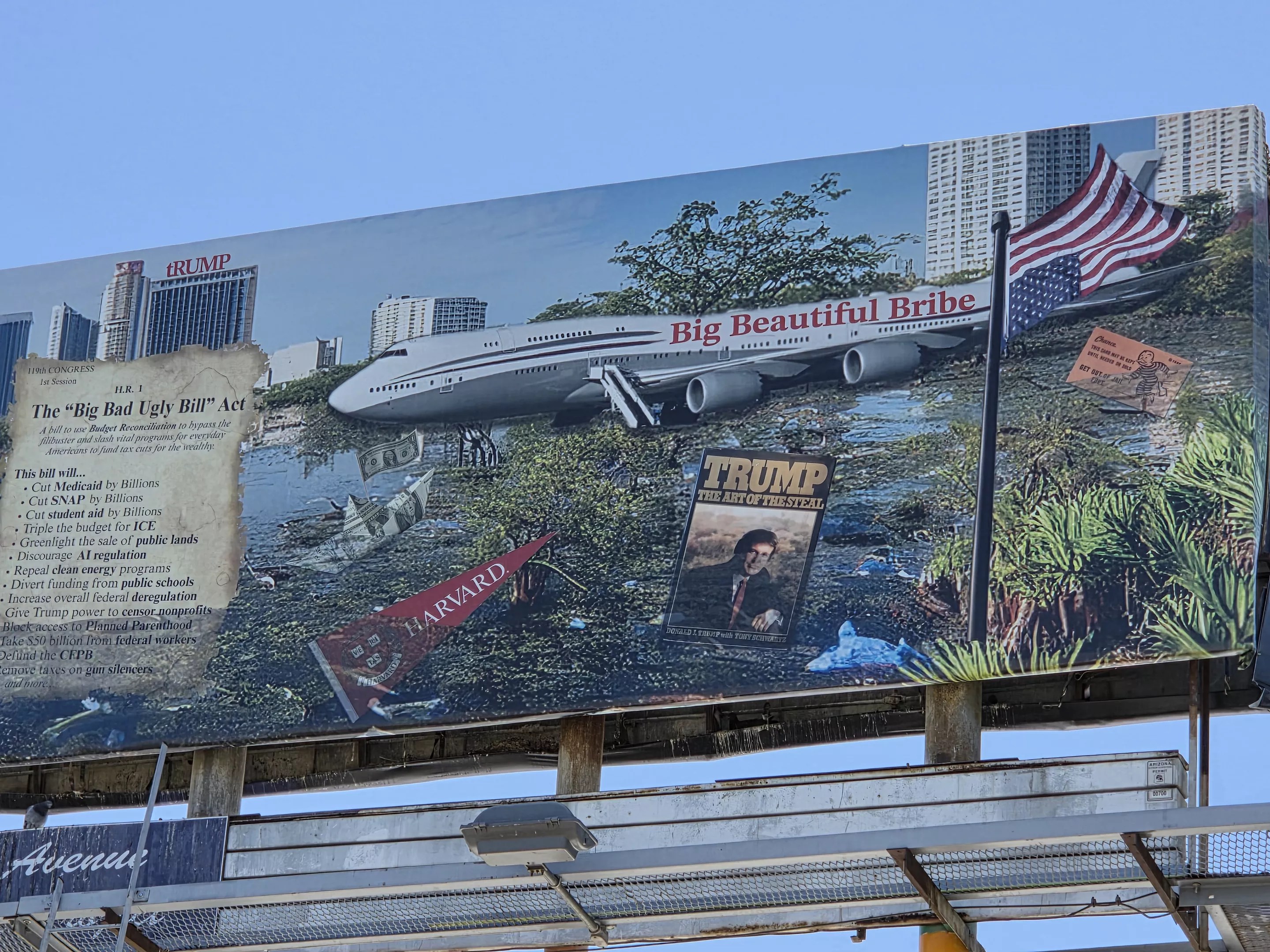 The billboard features an upside-down American flag, a sinking, vandalized Tesla Cybertruck, Trump’s Art of the Steal memoir, bombs exploding in the distance, his new Qatari jet with the words “Big Beautiful Bribe” printed across its sleek body, and a young bird flu victim. Just to the right of the baby (yet brawny) president is a nod to the new guards at the new Everglades detention facility: MAGA hat-wearing alligators.