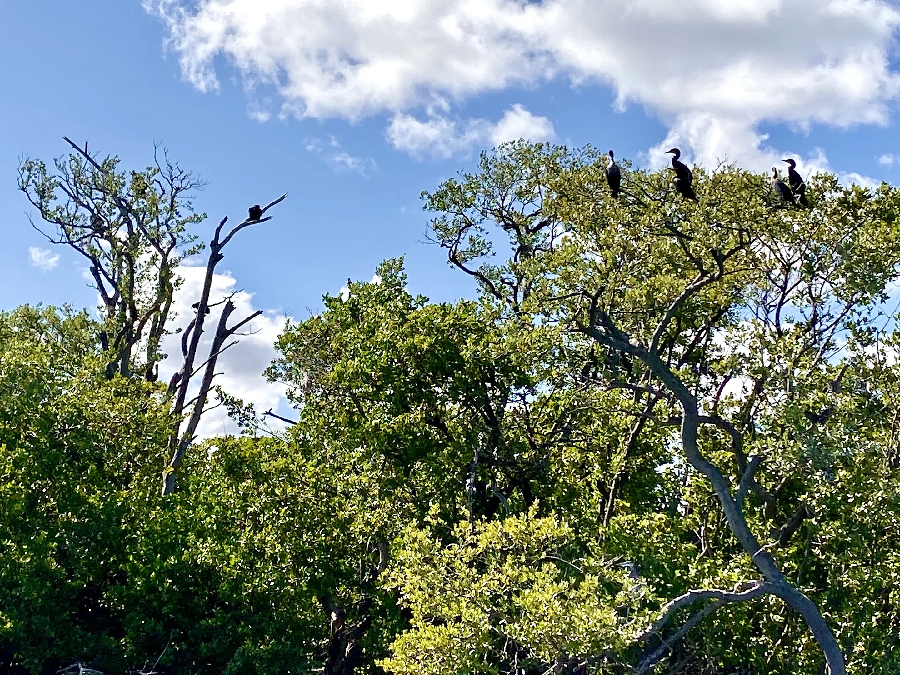 Birds sit atop the treeline on Bird Key, a privately owned island in Biscayne Bay, Miami, Florida.