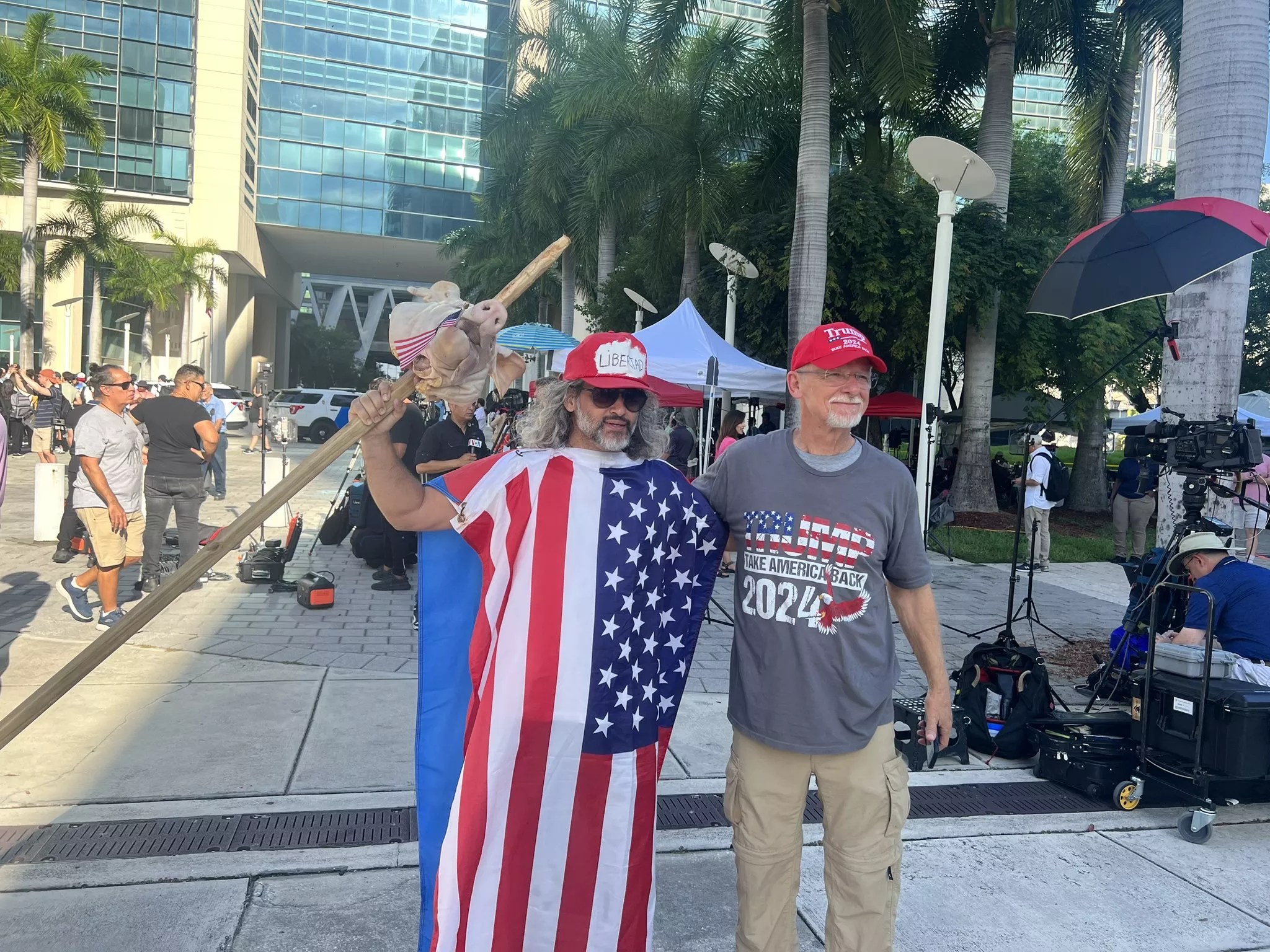 A man carrying a dripping pig’s head on a stick, a protester in a striped prison uniform, a gaggle of Blacks for Trump demonstrators, a few hundred members of the media, and a small army of law enforcement officials were among those who gathered outside the Wilkie D. Ferguson Jr. U.S. Courthouse in downtown Miami this morning in anticipation of former president Donald Trump’s history-making criminal arraignment, Tuesday, June 13.