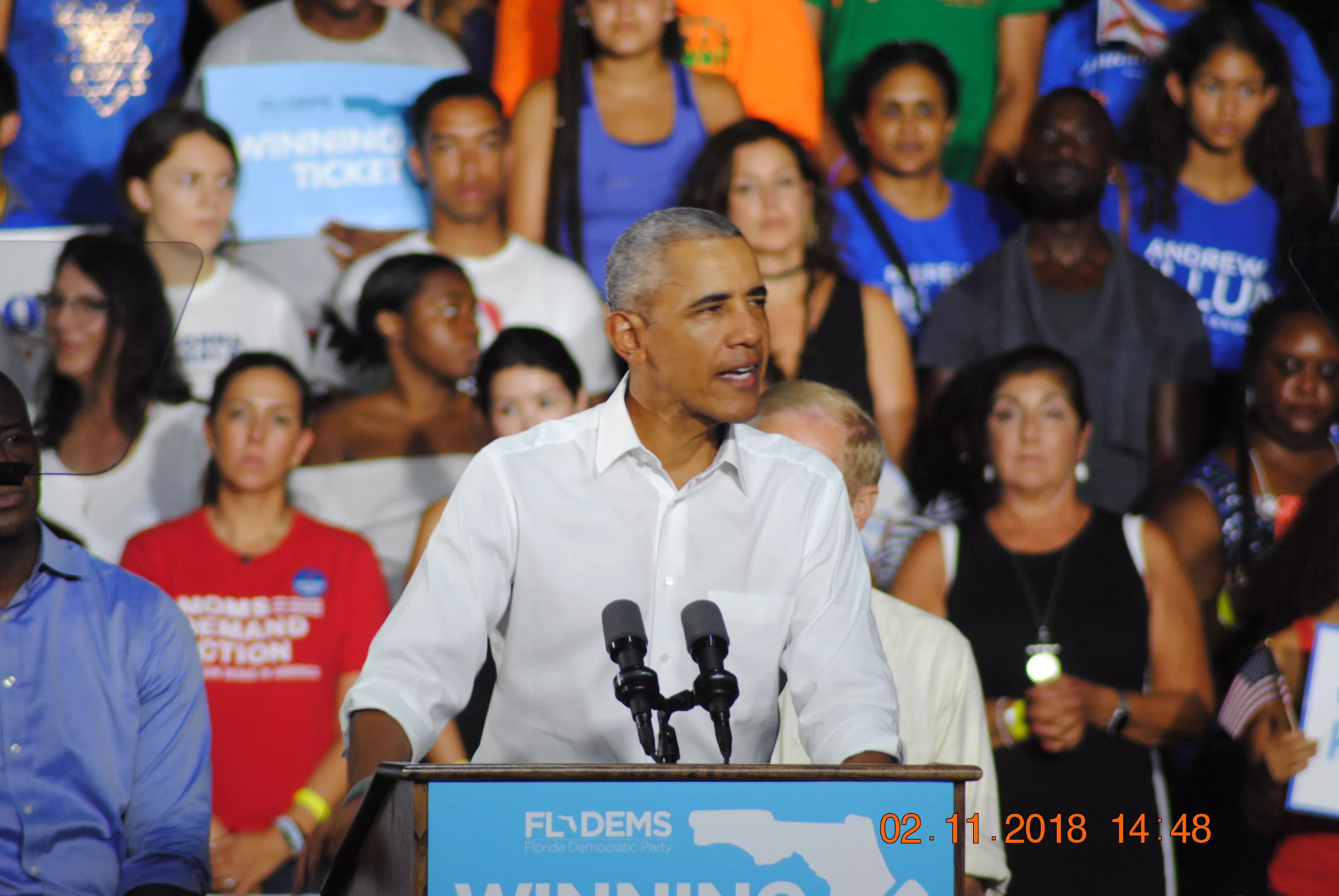 The rally drew thousands of Miamians, as well as people from across the state and nation who wanted to get an eyeful of the former president. Hawk Newsome, president of Black Lives Matter in New York, said he was in town registering voters before heading to Atlanta to work for Democratic gubernatorial hopeful Stacey Abrams, whom he called “sister Abrams.” He has also been campaigning for Democrats in Pennsylvania and Wisconsin in recent weeks. He said of Gillum: “We need to get this man elected. He is someone we really believe in.”