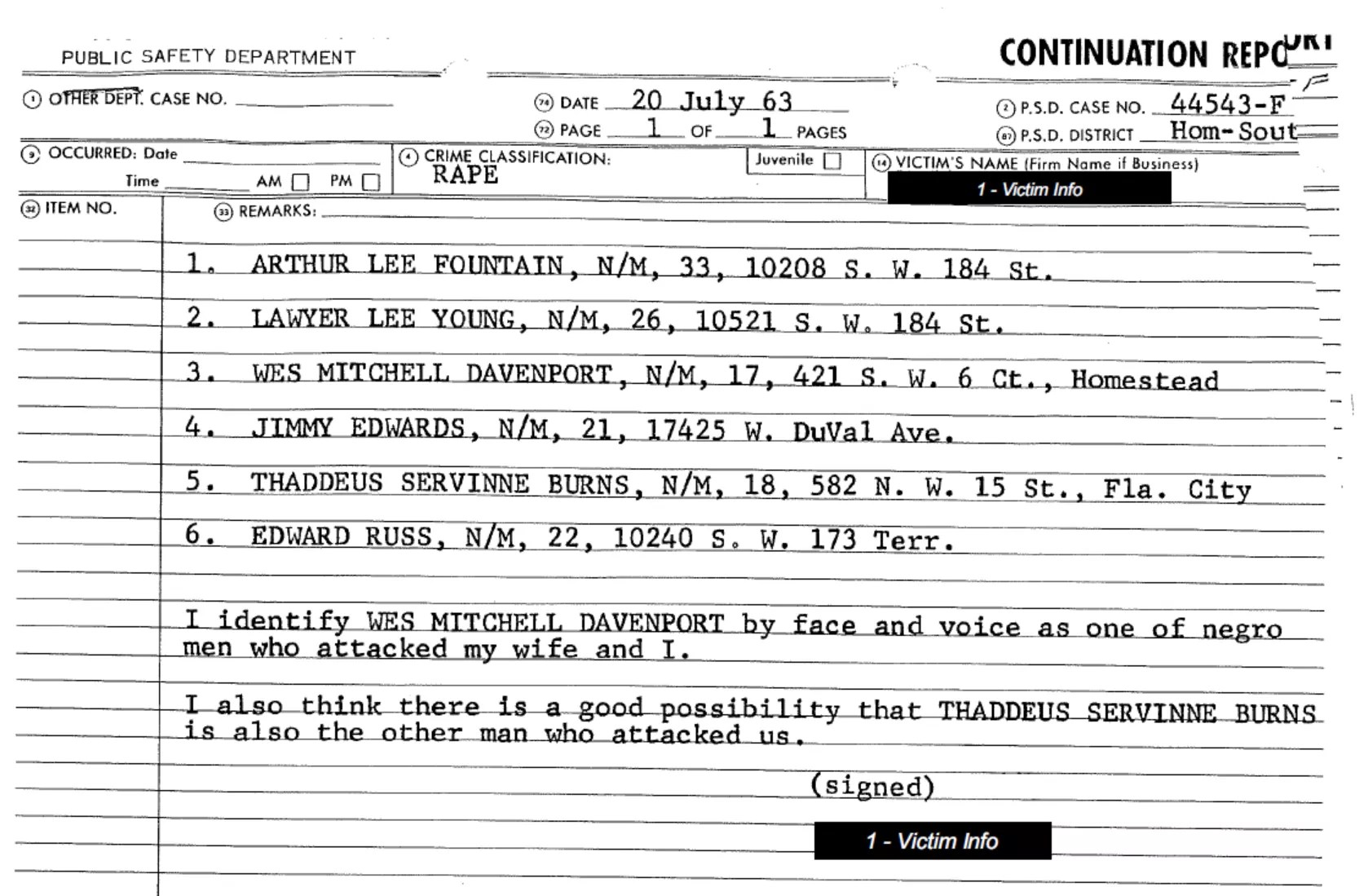 Yet police reports show that just a day after the attack, Nicholas implicated two different men. Shown a lineup of five young Black men, he first picked out a 17-year-old Homestead youth. His signed statement reads, “I identify Wes Mitchell Davenport by face and voice as one of the negro men who attacked my wife and I.”