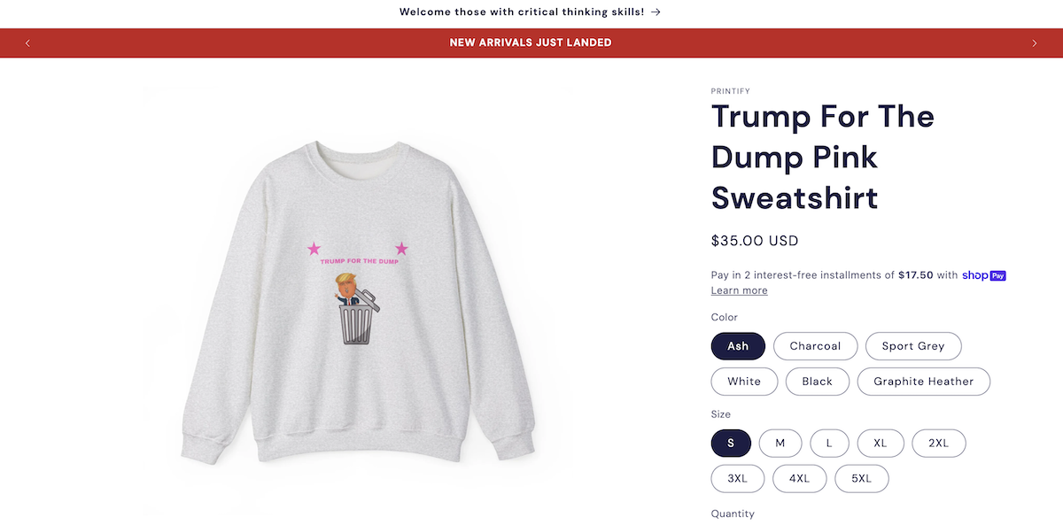 A crewneck for sale on the website features a graphic of a cartoon Trump inside a dumpster.