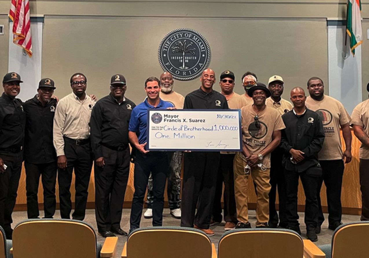 Suarez presented the check to the Circle of Brotherhood at an October 2021 ceremony, praising the organization for its work setting up programs for youth development, crime prevention, and economic sustainability in predominantly Black neighborhoods. The heavily promoted event was held before the funding was formally approved by the city commission.
