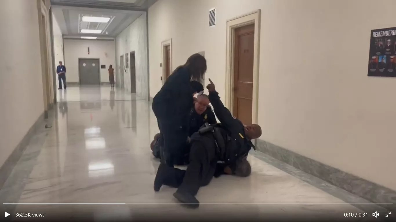 Outside the hearing room in the Rayburn House Office Building, bystanders chanted, “He is not violent! He is not violent!” while Capitol Police officers pinned Manuel to the ground and arrested him.