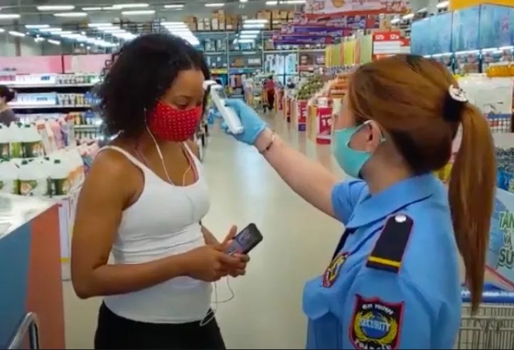 Christina Clesca has her temperature taken at a store in Vietnam.