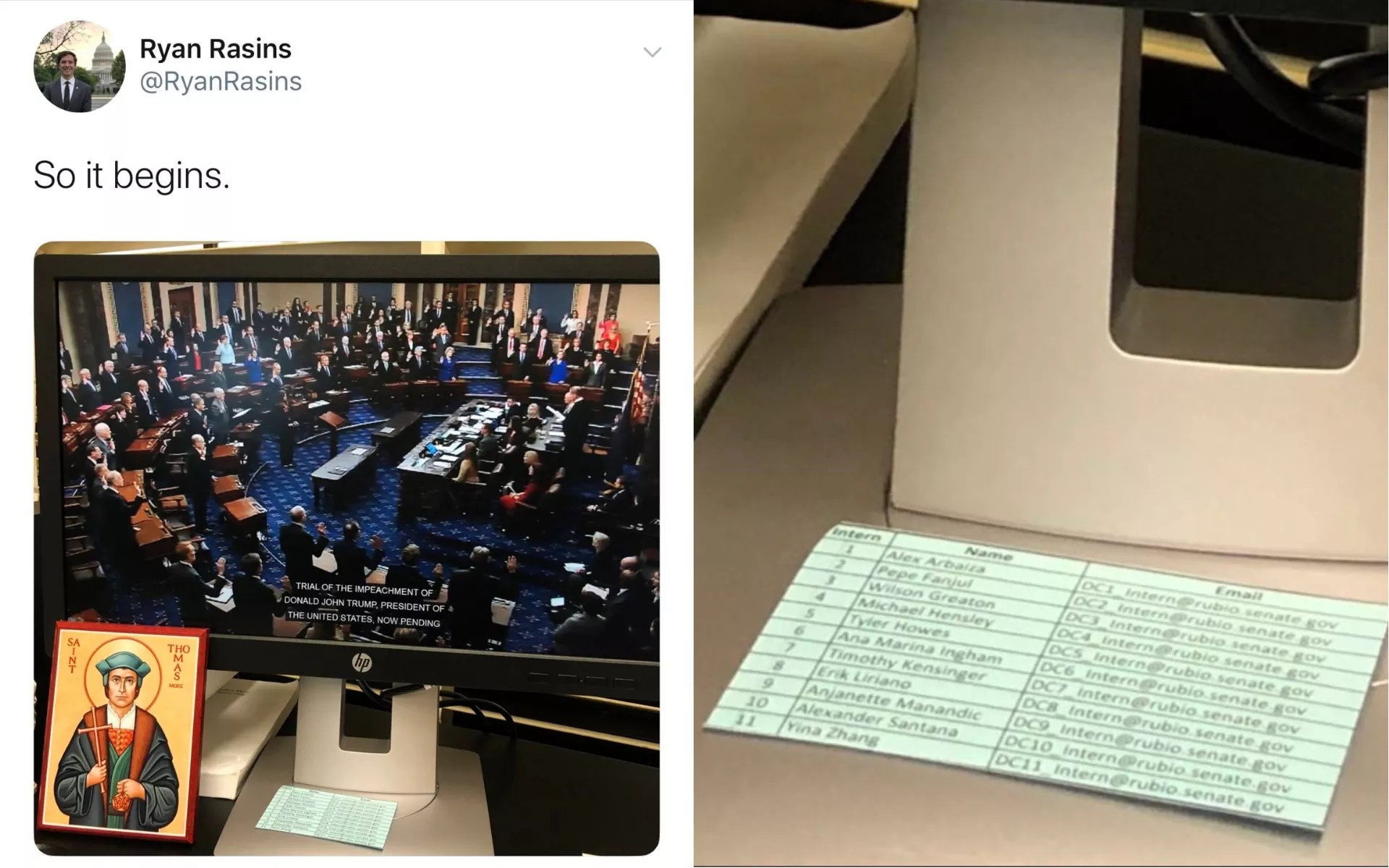 The photo was posted on Twitter by a young Rubio staffer named Ryan Rasins. He says online he worked as an intern in Rubio’s D.C. office last summer before joining the team full-time in September. On LinkedIn, Rasins lists himself as a “legislative correspondent” in Rubio’s office.