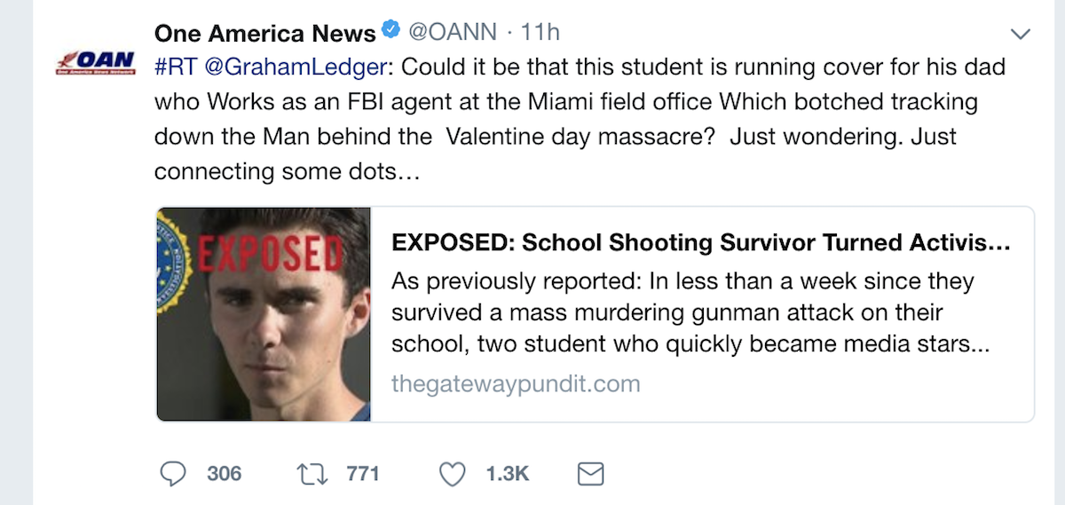 The site’s big conspiracy about Hogg is that — hold onto your pants — his dad is a retired FBI agent. It’s a fact that Hogg has repeatedly mentioned to TV reporters and is not at all a secret.
