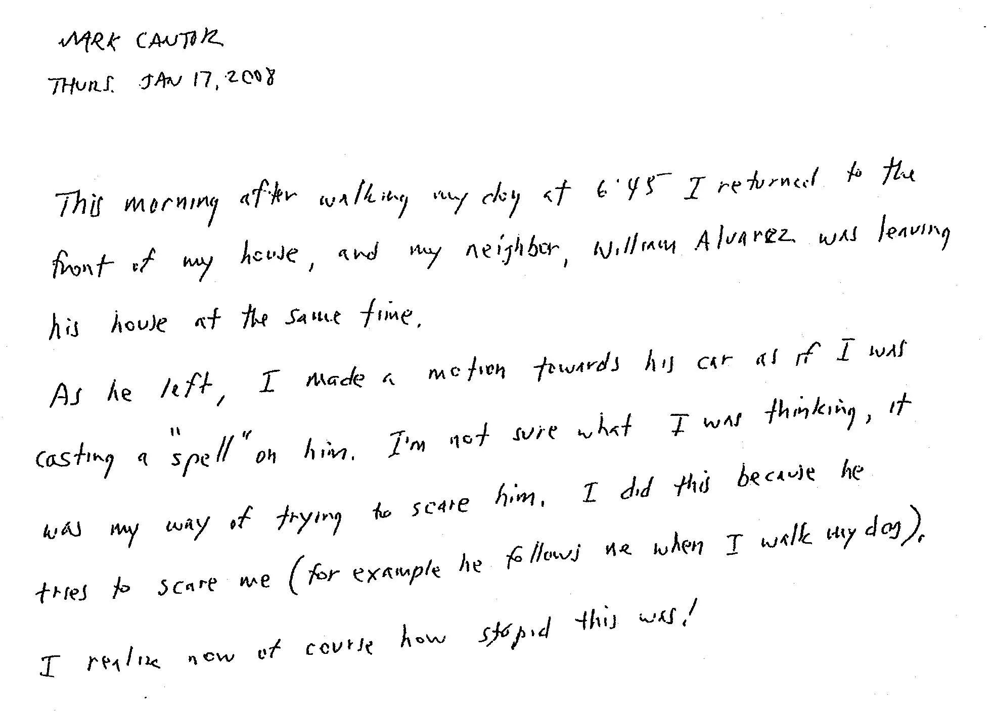 “This morning after walking my dog at 6:45, I returned to the front of my house, and my neighbor, William Alvarez, was leaving his house at the same time. As he left, I made a motion towards his car as if I was casting a “spell” on him. I’m not sure what I was thinking; it was my way of trying to scare him. I did this because he tries to scare me (for example, he follows me when I walk my dog). I realize now of course how stupid this was!”