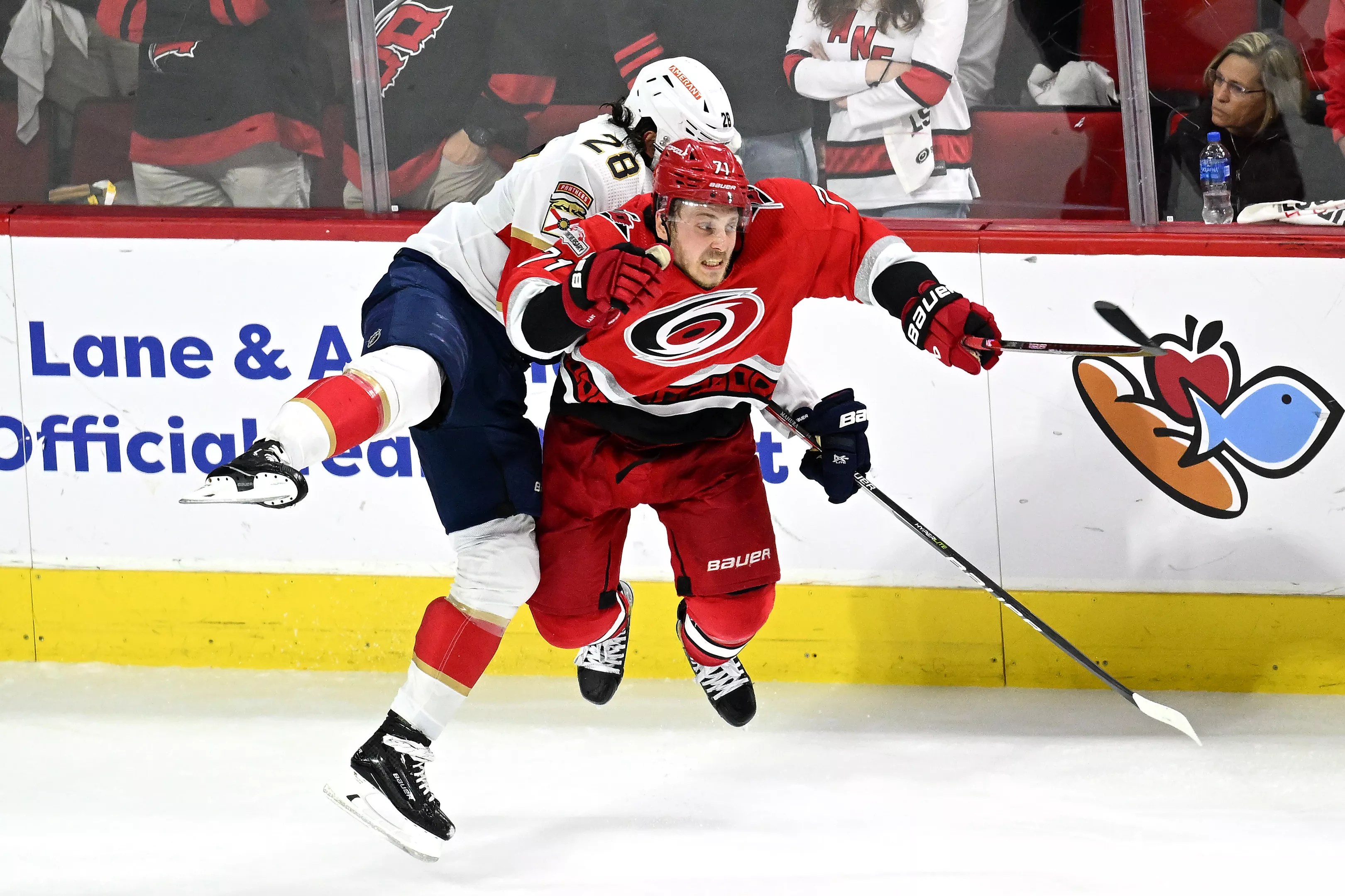Josh Mahura of the Florida Panthers collides with Jesper Fast of the Carolina Hurricanes during third overtime in Game One of the Eastern Conference Final of the 2023 playoffs on May 18, 2023.