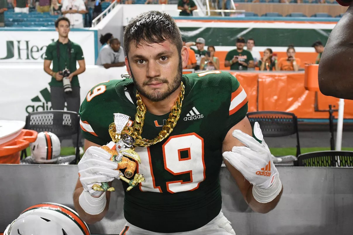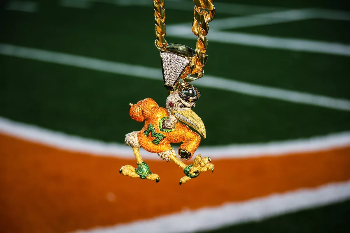 The Miami Hurricanes’ turnover chain made its much-anticipated season debut Saturday night during the Canes’ NSFW 77-0 beatdown of the Savannah State Tigers. At least we think they’re called the Tigers. When you lose 77-0, we’re not even bothering to Google your mascot. While everyone was expecting the Canes to bust out the trendsetting jewelry again, it was somewhat of a surprise to see the chain get a complete revamping in its second season. The “U” pendant is out, replaced by an oversize, blinged-out Sebastian the Ibis charm.