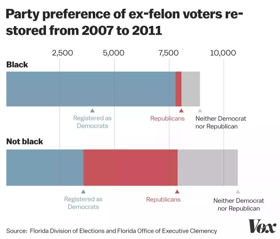 An analysis by Marc Meredith, a University of Pennsylvania political science professor; and Michael Morse, a Harvard PhD candidate, for Vox used Florida data from 2007 to 2011 to prove the point. During those four years, policies enacted by then-Gov. Charlie Crist automatically restored voting rights for nearly 150,000 former felons. Studying that group, the researchers found that only a small percentage turned out to the polls for elections – just 16 percent of black ex-felons and 12 percent of nonblack ex-felons. (The authors say they were unable to separate white, Hispanic, Asian, and other voters into groups.)