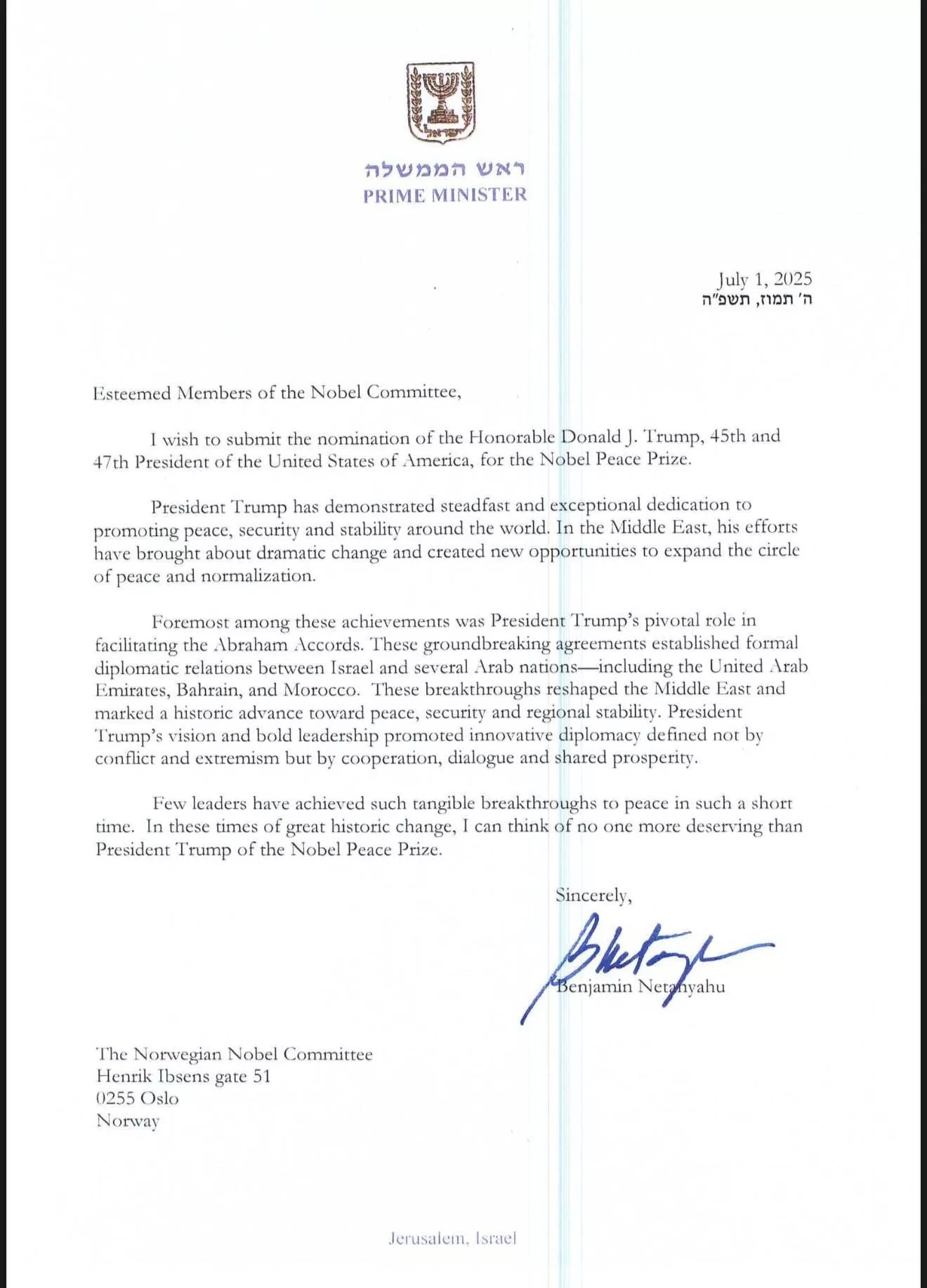 “Few leaders have achieved such tangible breakthroughs to peace in such a short time,” Netanyahu writes. “In these times of great historic change, I can think of no one more deserving than President Trump of the Nobel Peace Prize.”
