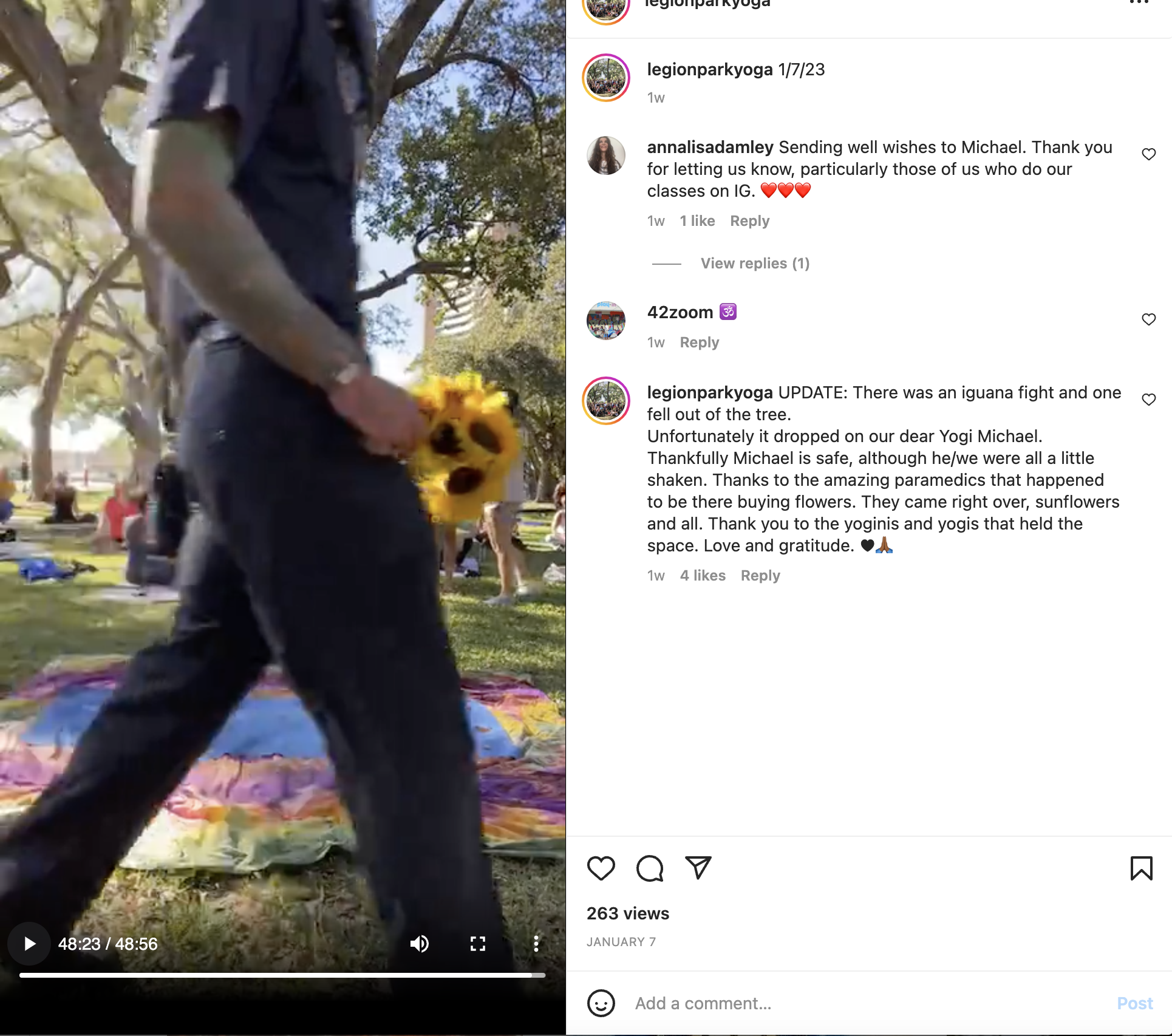 Nearby yogis who had their eyes open at the fateful moment would later inform Michael that his assailant was a green iguana weighing “between 20 and 30 pounds.” Though iguanas are locally and nationally famed for lapsing into temporary paralysis and falling from high places when ambient temperatures drop below 50 degrees Fahrenheit, witnesses reported that this particular specimen had been dueling with an even larger iguana on a branch roughly 25 feet off the ground.