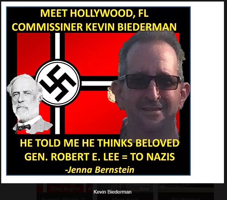 The group has also separately disseminated some extremely offensive memes online: When Hollywood Commissioner Kevin Biederman expressed support for changing the name of a street honoring Confederate Gen. Robert E. Lee, Save Southern Heritage Florida placed an image of Biederman’s face next to that of a Nazi flag: